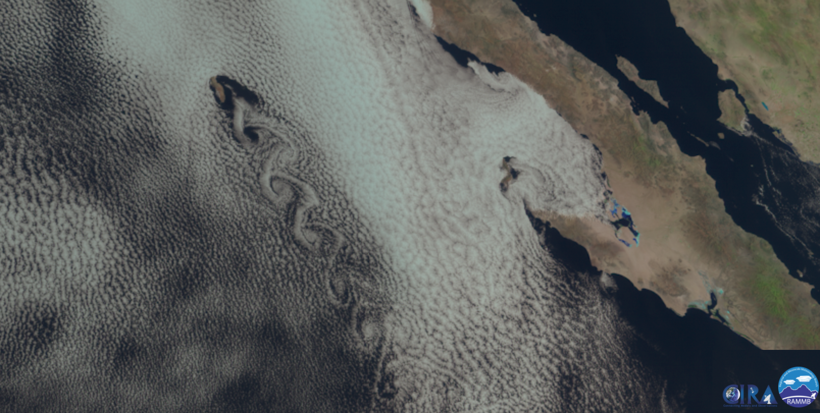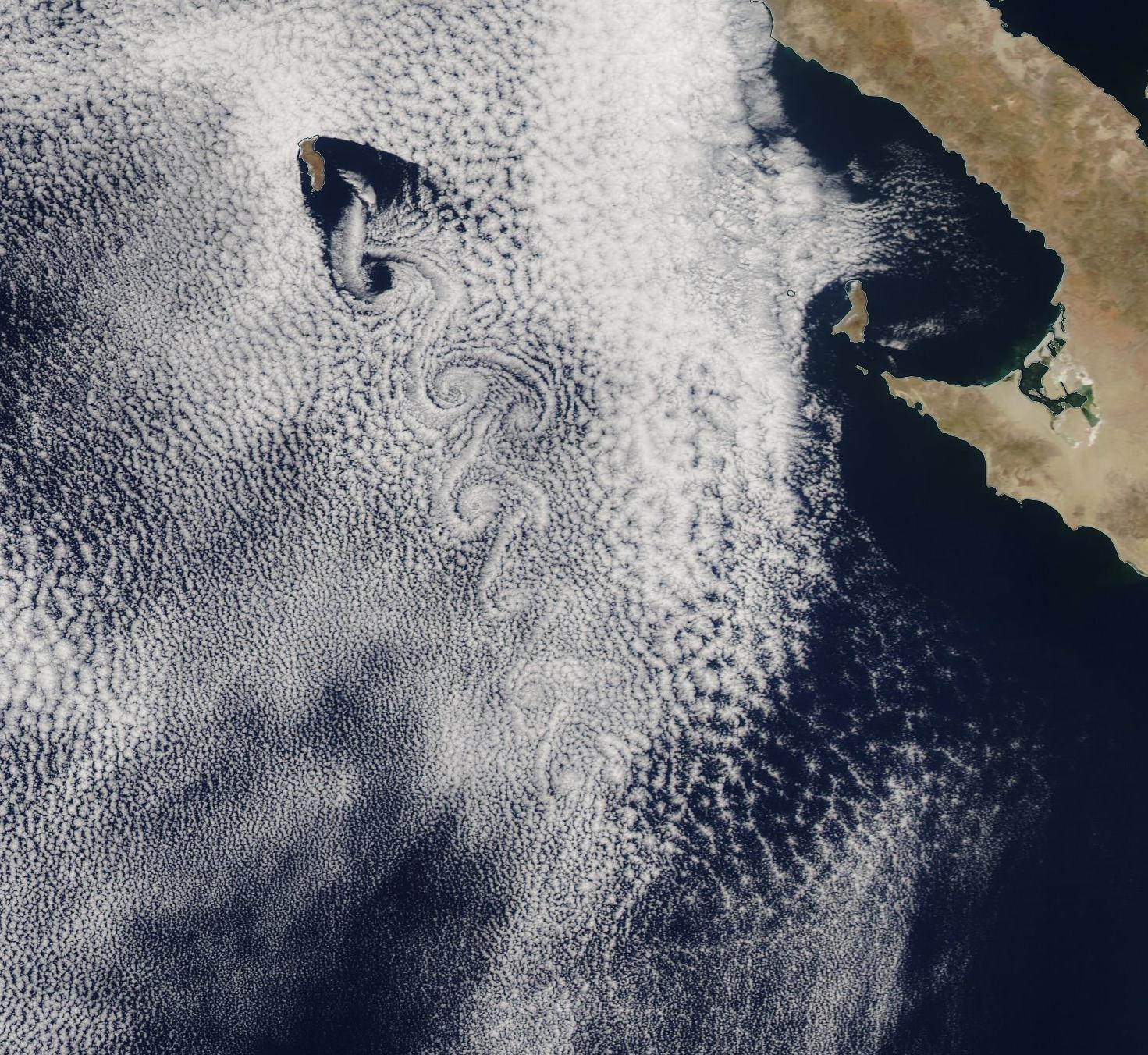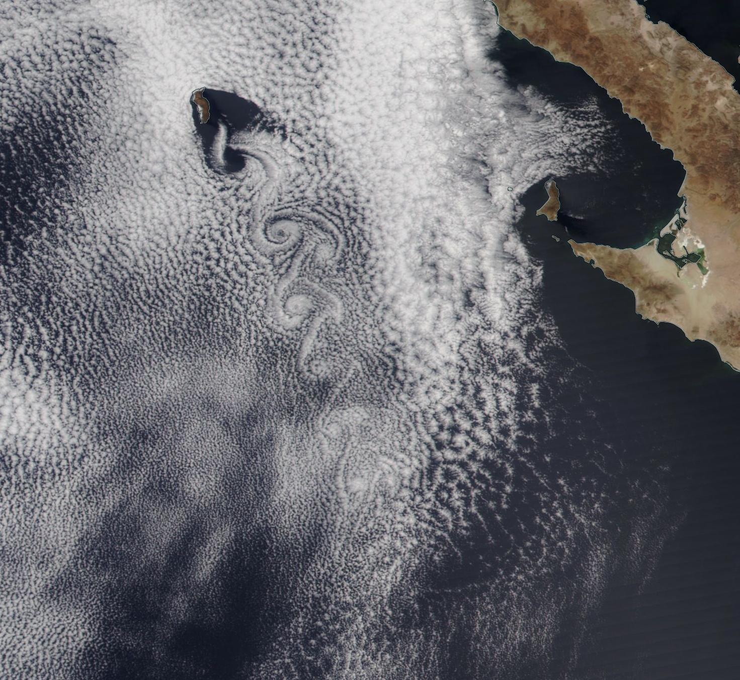 Ενα απο τα πολυ ωραια ατμοσφαιρικα φαινομενα συνεβησε χθες το απογευμα ωρα Ελλαδας στην Νησο Γουαδαλουπη(δυτικα του Μεξικο) αφου η ροη ηταν τετοια στην ατμοσφαιρα και λογω φυσικα και του εμποδιου του ηφαιστειακου αυτου νησιου με βουνα υψους 1300 μετρων, που ευνοησε την δημιουργια του λεγομενου von Karman vortex street.