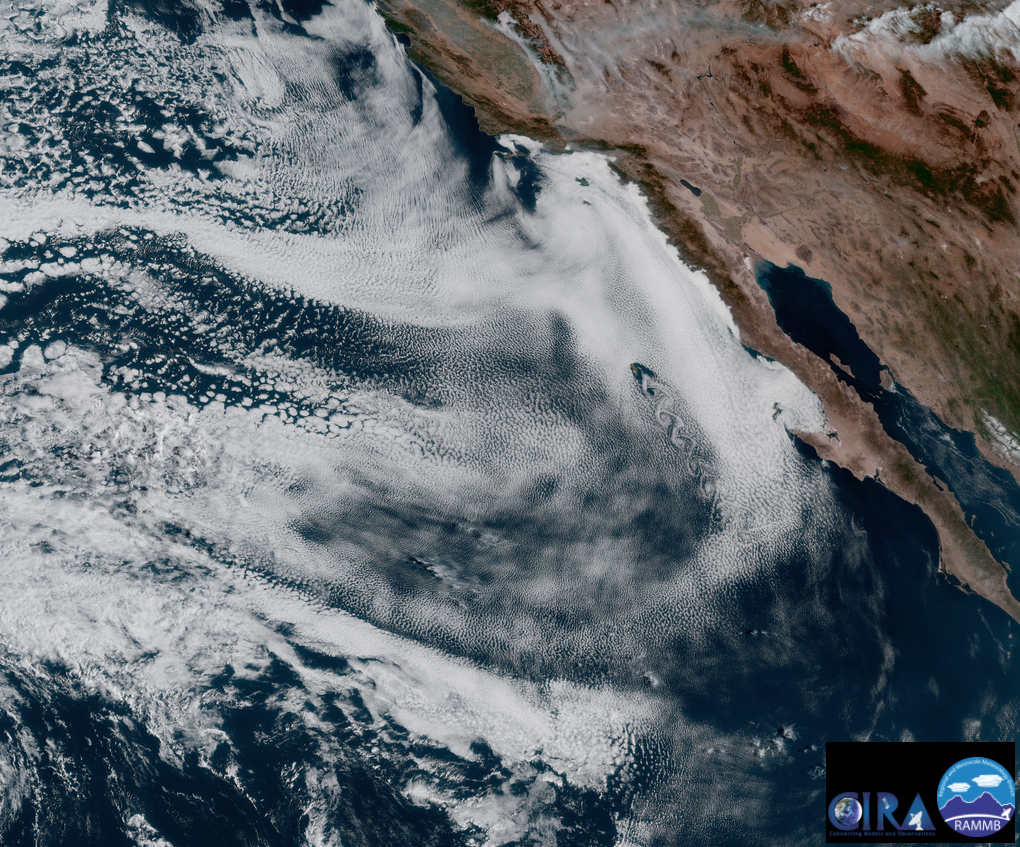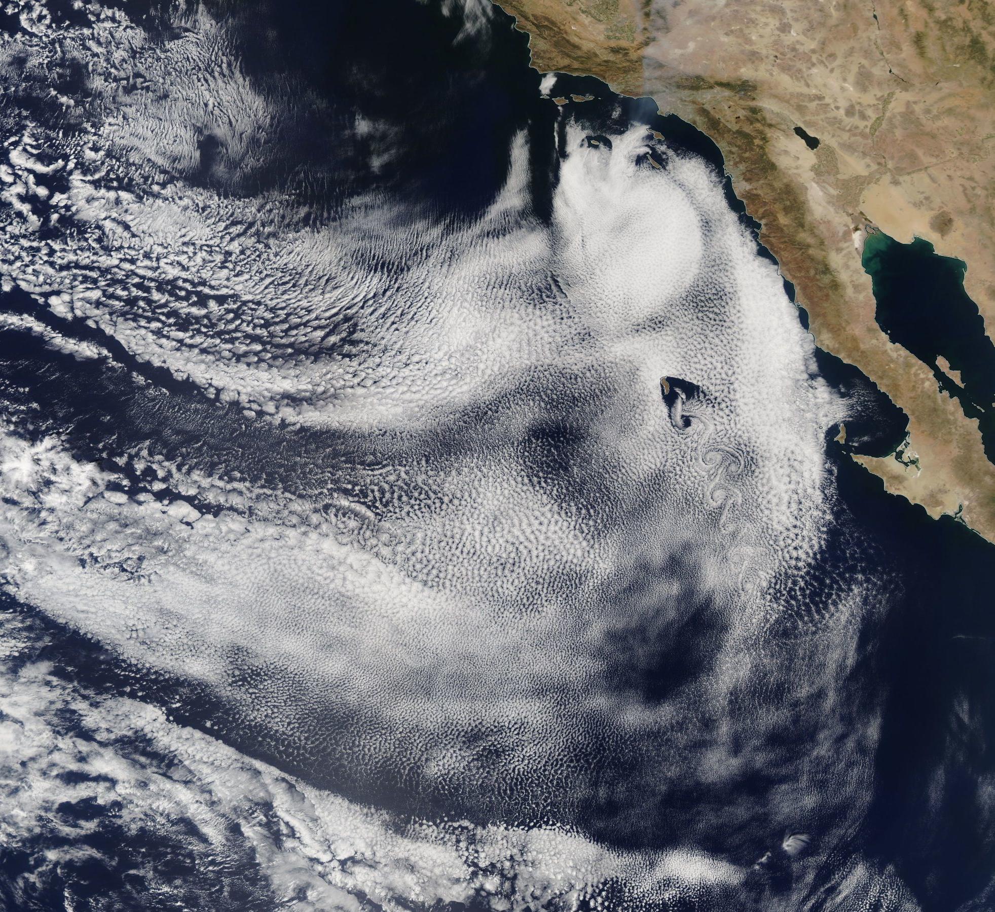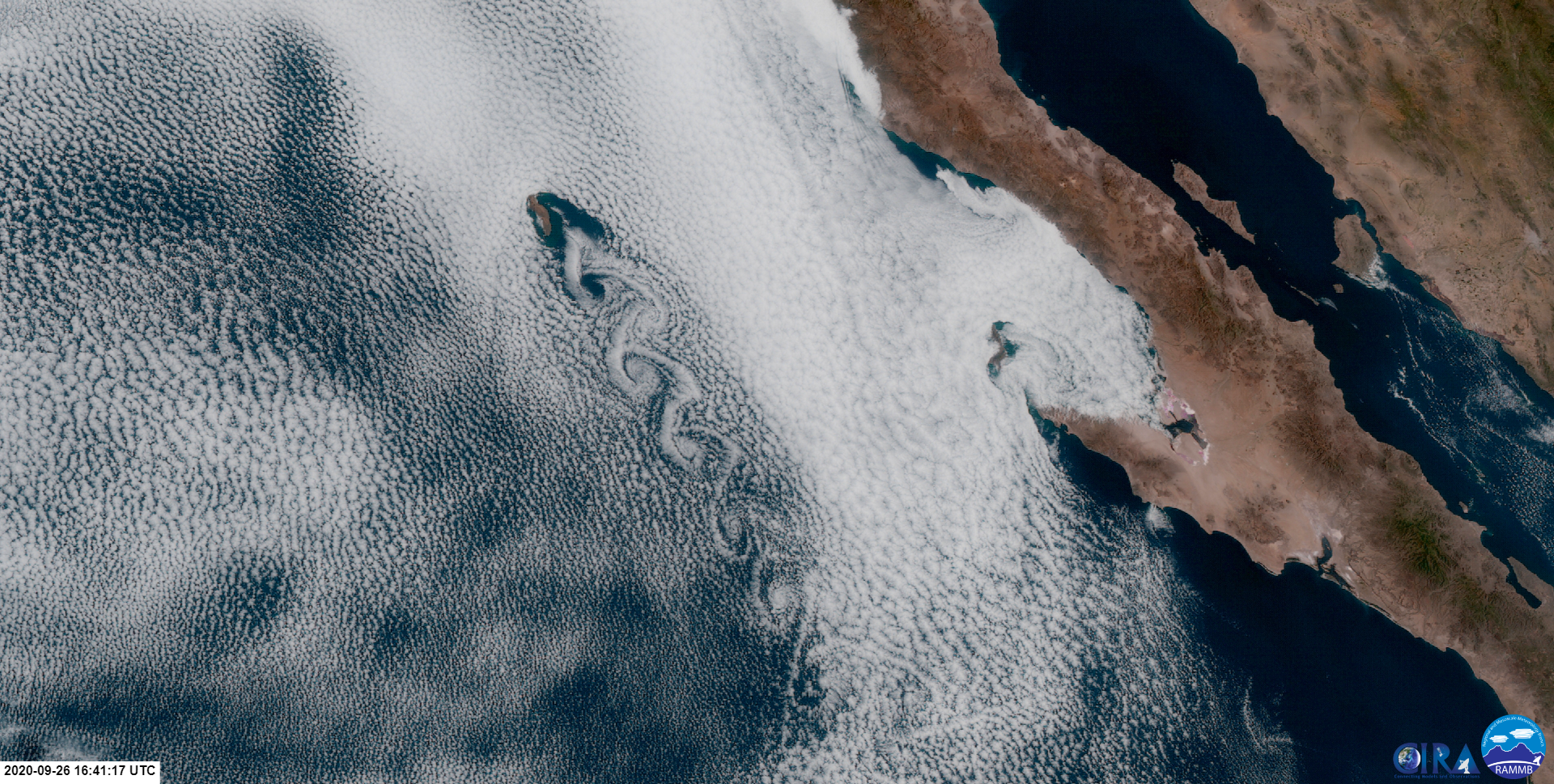 Ενα απο τα πολυ ωραια ατμοσφαιρικα φαινομενα συνεβησε χθες το απογευμα ωρα Ελλαδας στην Νησο Γουαδαλουπη(δυτικα του Μεξικο) αφου η ροη ηταν τετοια στην ατμοσφαιρα και λογω φυσικα και του εμποδιου του ηφαιστειακου αυτου νησιου με βουνα υψους 1300 μετρων, που ευνοησε την δημιουργια του λεγομενου von Karman vortex street.