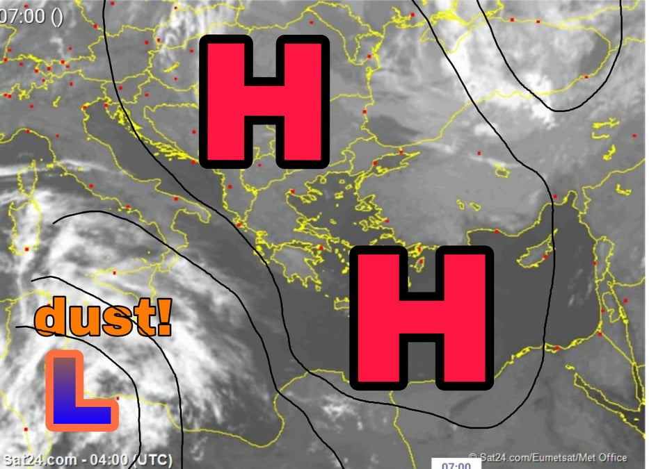 Οι αραιές νεφώσεις που ήδη διακρίνονται να μας πλησιάζουν από τα δυτικά, μέσα στην Παρασκευή, και καθώς η όλη διαταραχή θα ξεκινήσει να ανηφορίζει για τα νερά της Μεσογείου, θα διασπάσουν αυτόν τον αντικυκλώνα, με τα βαρόμετρά μας να ξεκινάνε την πτώση από την ίδια μέρα. Παράλληλα, η σκόνη, κυρίως από το απόγευμα και μετά, θα αρχίσει να γίνεται αντιληπτή στην ατμόσφαιρα της νότιας χώρας.