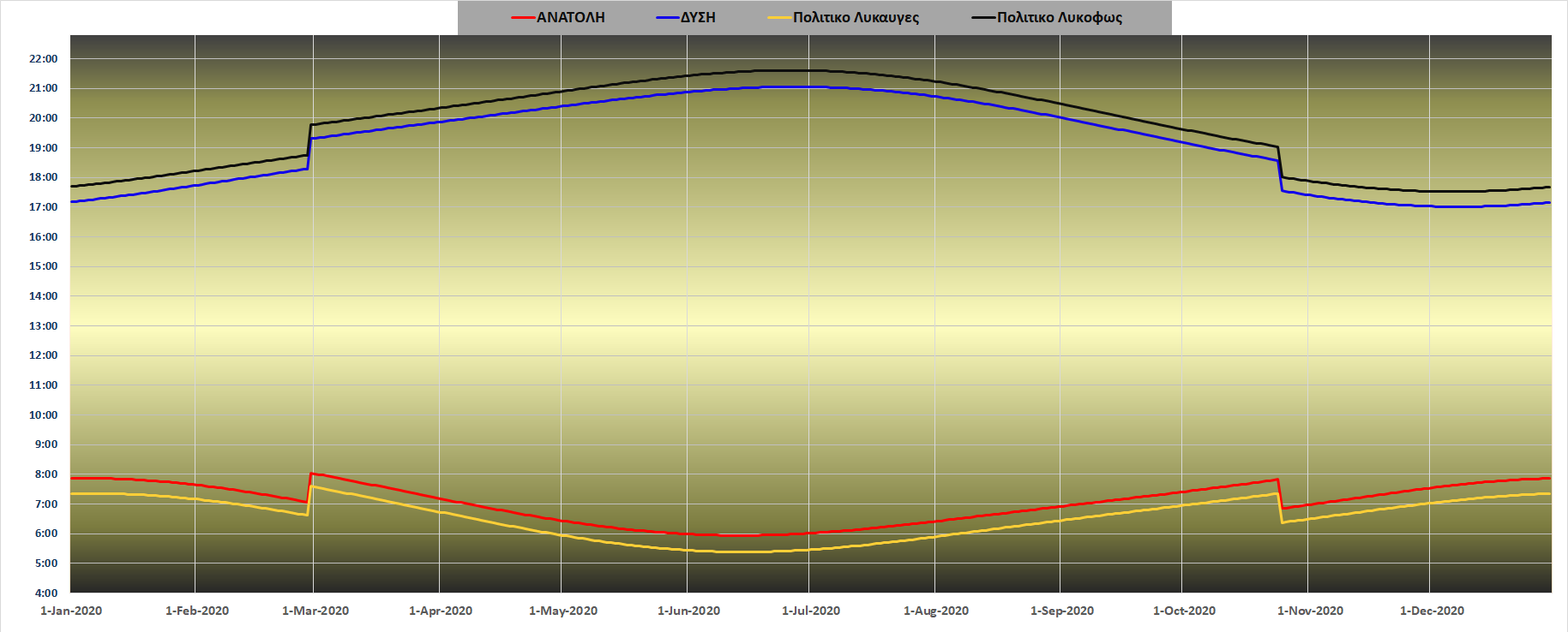 Εδω ειναι οι ωρες ανατολης και δυσης του ηλιου καθως και του πολιτικου λυκαυγους και λυκοφωτος(οι ωρες πριν και μετα την ανατολη και δυση του ηλιου αντιστοιχα οπου υπαρχει φως ενω ο ηλιος δεν εχει ανατελλει/δυσει ακομα) για την Θεσσαλονικη(40.65° N , 23.00° Ε) για το 2020 απο ενα ακριβες ημερολογιο που λαμβανει υποψη και την διαθλαση του ηλιου και την σφαιρικη του υποσταση.