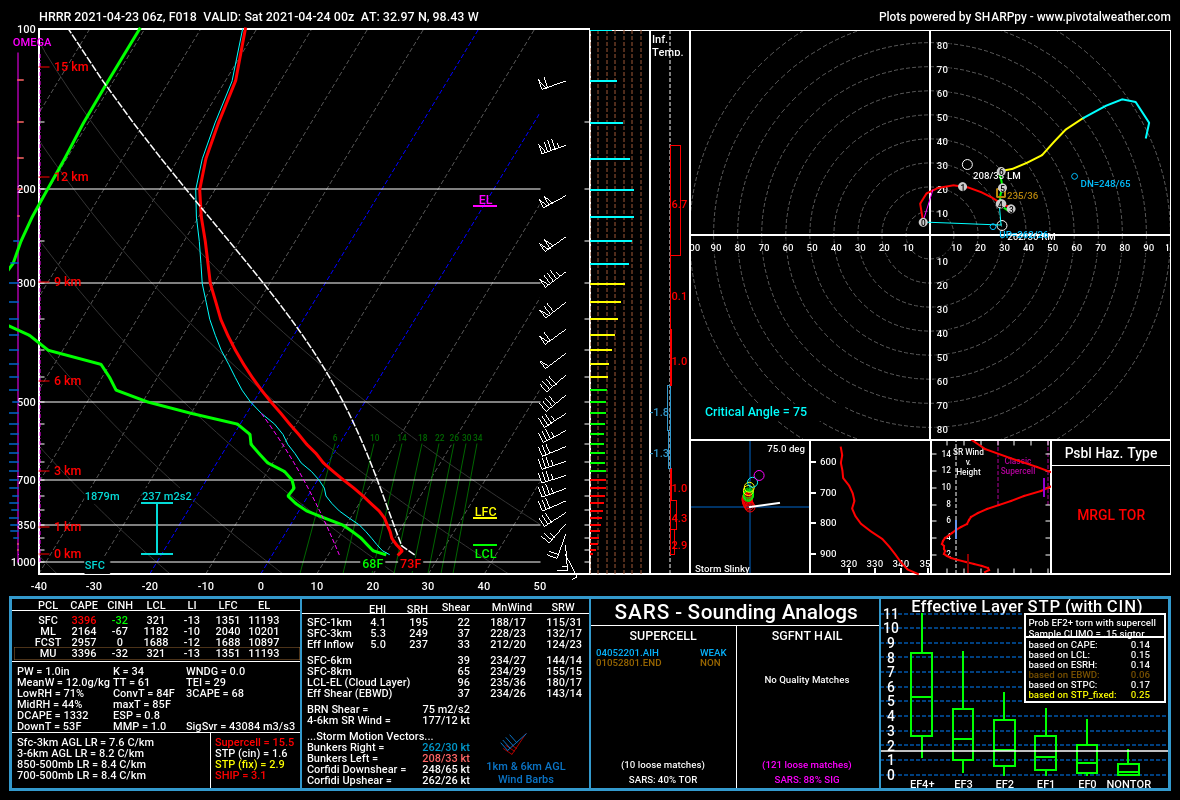 Τα καιρικα μοντελα ηταν σαφη χθες για το Τεξας των ΗΠΑ. Προεβλεπαν πολυ μεγαλη ασταθεια στην ατμοσφαιρα αλλά και μεγαλες διατμησεις, συστατικα που οταν υπαρχουν η πιθανοτητα για ισχυρες καταιγιδες με supercell και ανεμοστροβιλους αρχιζει και γινεται μεγαλη. Αρκει βεβαια να υπαρχει αρκετη υγρασια και ενα αιτιο ανυψωσης του αερα απο τα κατω στρωματα του εδαφους προς τα πανω.