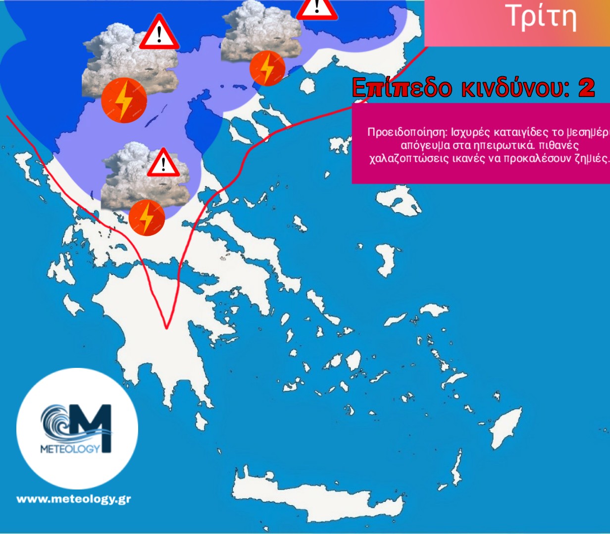 Μια ασθενή διαταραχή θα διασχίσει μέσα στην Τρίτη την κεντρική και βόρεια χώρα. Η διαταραχή αυτή θα συνδυαστεί με την μεσημεριανή ζέστη και θα πυροδοτήσει αναπτύξεις καταιγίδων. Στις περιοχές που τονίζονται στον χάρτη, δηλαδή σε εσωτερικό Θεσσαλίας, Μακεδονία και εσωτερικό Θράκης: Το μεσημερι και το απόγευμα, θα εκδηλωθούν καταιγίδες τοπικά ισχυρές. Αυξημένη η πιθανότητα αυτές να συνοδεύονται από ΧΑΛΑΖΌΠΤΩΣΗ ικανή να προκαλέσει προβληματα και ζημιές σε καλλιέργειες. Ραγδαίες θα είναι και οι βροχοπτώσεις που θα συνοδεύουν τους πυρήνες αυτούς. Στην ζώνη των επικίνδυνων καιρικών φαινομένων συμπεριλαμβάνεται και ο νομός Θεσσαλονίκης. Επίπεδο επικινδυνότητας 2 εκδίδεται για το σύνολο των ηπειρωτικών περιοχών κυρίως γιατί οι καταιγίδες ενδεχομένως να συνοδεύονται από πολύ ισχυρούς ανέμους ( μπουρίνια ) και χαλαζοπτώσεις. Δείξτε προσοχή στις μετακινήσεις σας, λάβετε τα κατάλληλα μέτρα προστασίας, όσοι θα δραστηριοποιηστε στην ύπαιθρο.