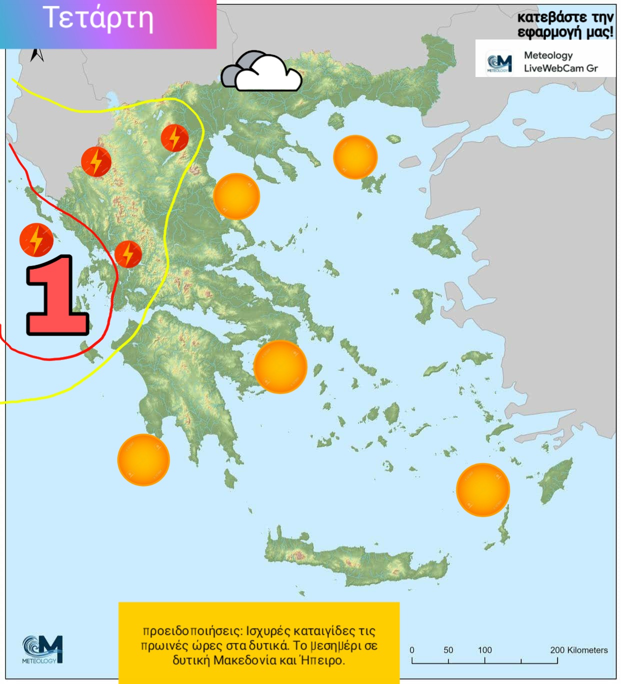 Η διαταραχή κάνει την είσοδο της στον ελλαδικό χώρο, ήδη από τα ξημερώματα της Τετάρτης. Έτσι τις πρώτες πρωινές ώρες της Τετάρτης: Από το ύψος περίπου της Κεφαλονιάς και βορειότερα, με έμφαση στο βόρειο Ιόνιο και την Ήπειρο, θα εκδηλωθούν καταιγίδες. Επίπεδο κινδύνου 1 εκδίδεται για όλα τα Επτάνησα και τα παράκτια της Ηπείρου καθώς οι καταιγίδες αυτές, θα είναι καλά οργανωμένες και θα συνοδεύονται από πολύ ισχυρούς ανέμους , χαλαζόπτωση αλλά και ραγδαίες βροχοπτώσεις. Αποφύγετε κάθε είδους δραστηριότητα το πρωινό της Τετάρτης στα παραπάνω τμήματα. Οι καταιγίδες αυτές, θα εξασθενούν καθώς θα προχωράνε στα ενδότερα των ηπειρωτικών, αλλά προς το μεσημέρι, νέες εστίες καταιγίδων θα αναπτυχθούν πάνω από την δυτική Μακεδονία, με εξίσου έντονο χαρακτήρα. Αργά την νύχτα, θα επηρεαστεί και η κεντρική Μακεδονία αλλά και τμήματα της Θεσσαλίας.