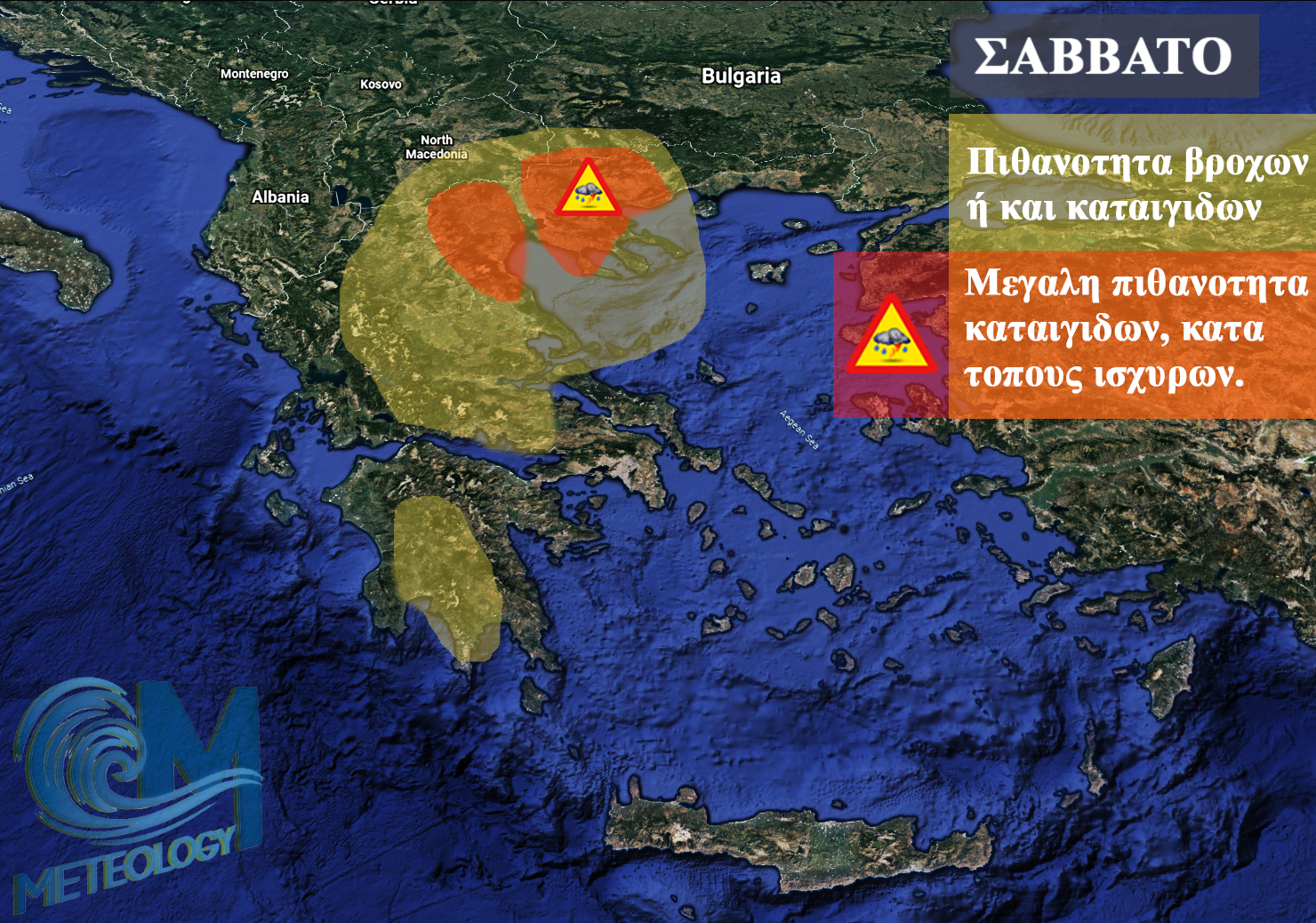 Στα παραπάνω τμήματα, τις μεσημεριανές και πρώτες απογευματινές ώρες, θα αναπτυχθούν καταιγίδες οι οποίες ενδεχομένως να είναι ισχυρές και να συνοδεύονται από πολύ ισχυρούς ανέμους ( μπουρίνια), έντονη ηλεκτρική δραστηριότητα και χαλαζόπτωση. Αποφύγετε τις εξωτερικές δραστηριότητες τόσο στην ξηρά, όσο και στα θαλάσσια τμήματα των παραπάνω διαμερισμάτων. Ο καιρός καθαρίζει παντού από αργά το απόγευμα, έτσι η νύχτα προς την Κυριακή αλλά και η Κυριακή θα κυλήσουν με πολύ καλές καιρικές συνθήκες.