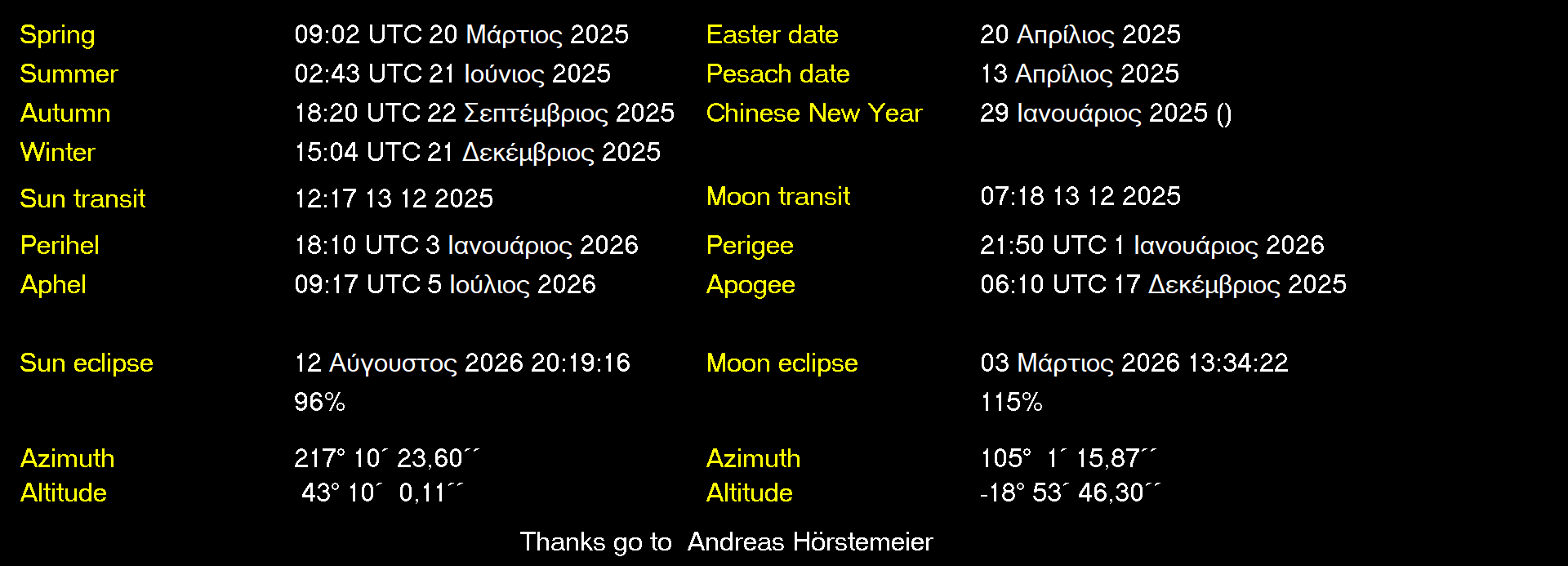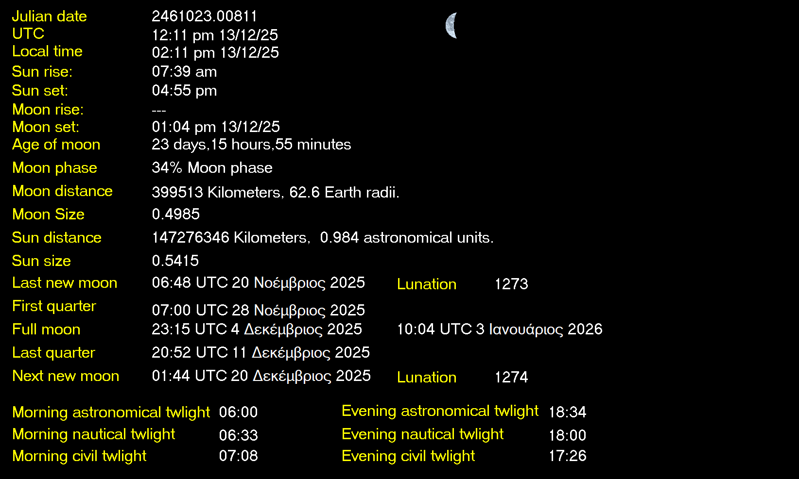 Ανατολή Σελήνης: 01:21 (13/12/2025) Δύση Σελήνης: 13:04 (13/12/2025) Φθίνουσα Σελήνη 36% Φωτεινότητα |