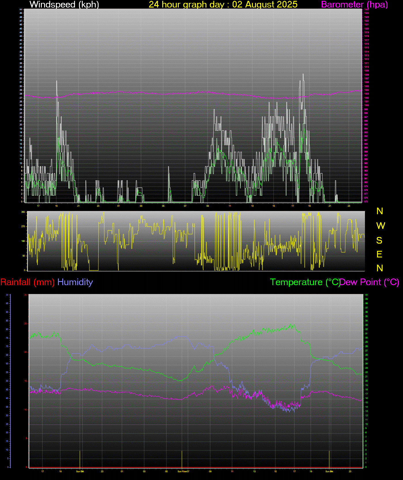 | Μέγιστη ταχύτητα ριπών ανέμου | 9.3 km/h στις 294°(ΔΒΔ) τον 02 στις 20:01 |