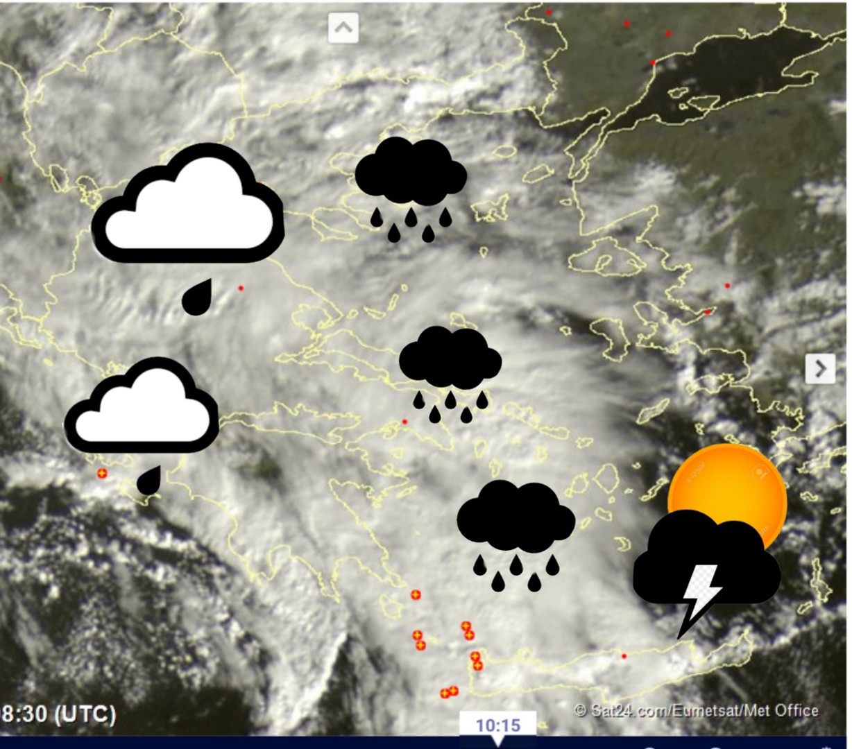 Εξασθενούν τις αμέσως επόμενες ώρες τα φαινόμενα στην δυτική Ελλάδα, με την ηλιοφάνεια να παίρνει το πάνω χέρι, από το μεσημέρι και μετά. Η καιρική δραστηριότητα, θα εντοπίζεται στην ανατολική πλευρά της Πίνδου και το Αιγαίο. Εδώ οι συννεφιές θα δίνουν τοπικές βροχές και λίγες διάσπαρτες Καταιγίδες στα θαλάσσια και παράκτια τμήματα. Προς το βράδυ και εδώ ο καιρός θα βελτιωθεί. Οι νοτιάδες θα γυρίσουν σε ΑΒΑ από το απόγευμα και θα εξασθενήσουν. Βελτιωμένος ο καιρός την Κυριακή σε όλη την χώρα. Πηγή εικόνας: sat24. com