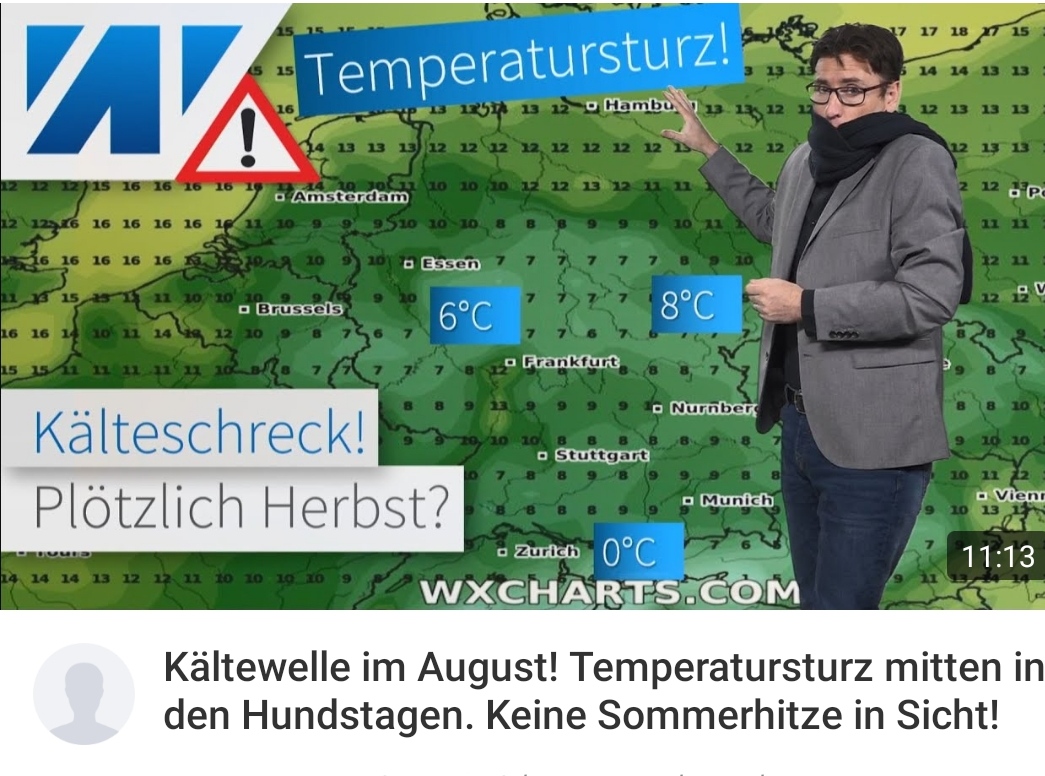 Την ίδια ώρα που η Μεσόγειος και η χώρα μας, δοκιμάζεται από το πρώτο μεγάλο κύμα καύσωνα μετά από αρκετά καλοκαίρια, στην υπόλοιπη κεντρική και βόρεια Ευρώπη, οι πρώτες μέρες του Αυγούστου, αναμένεται να φέρουν ασυνήθιστο κρύο για την εποχή, το οποίο θα θυμίσει μάλλον Νοέμβρη! Χαρακτηριστικό είναι το στιγμιότυπο δελτίου καιρού κατά το οποίο ο παρουσιαστής βγαίνει ντυμένος με χειμερινά ρούχα, στην καρδιά του καλοκαιριού!