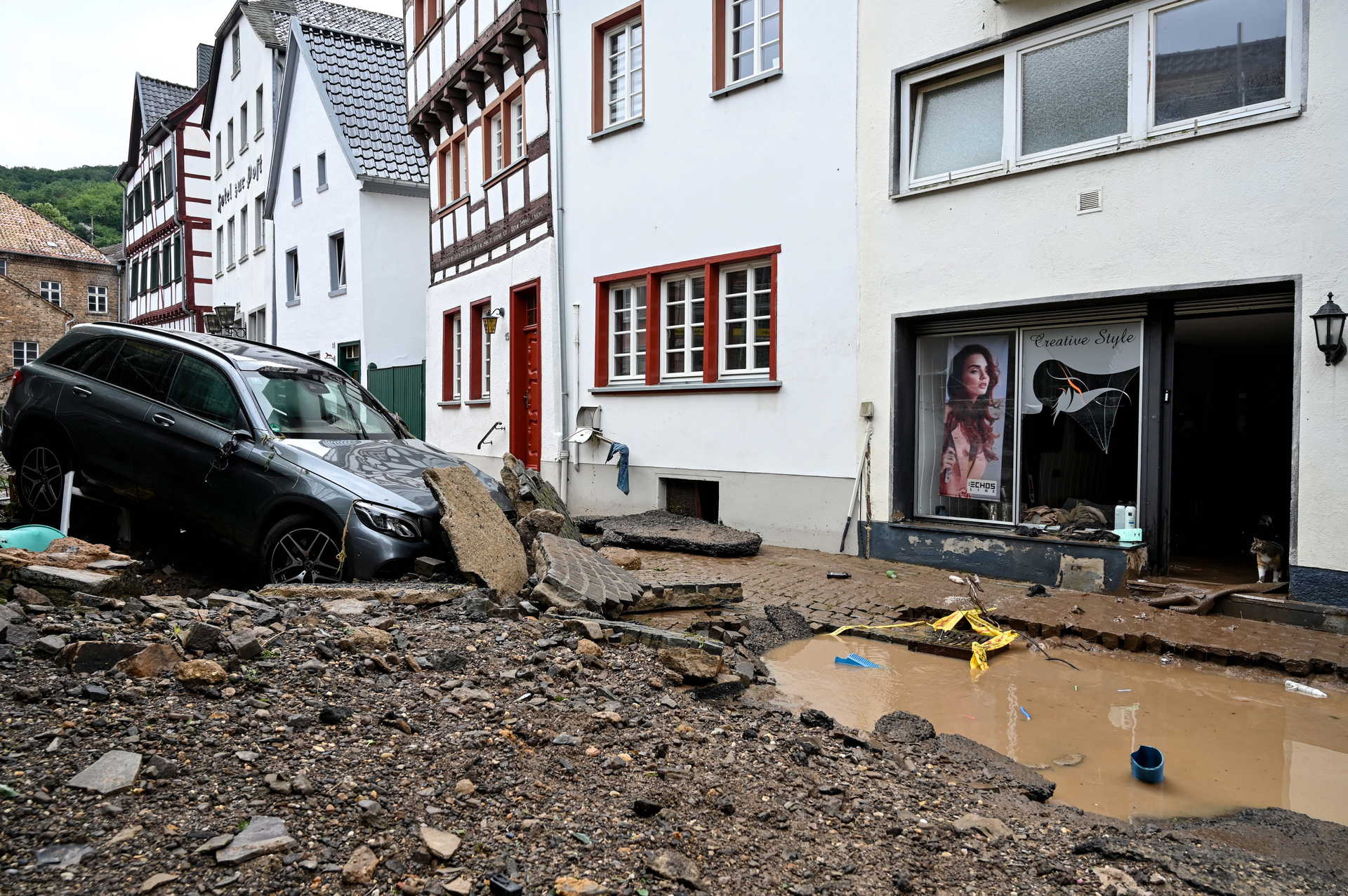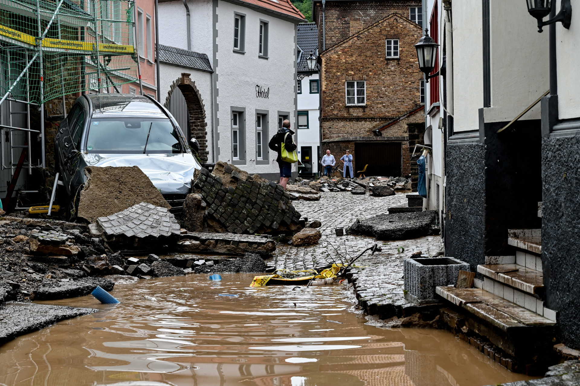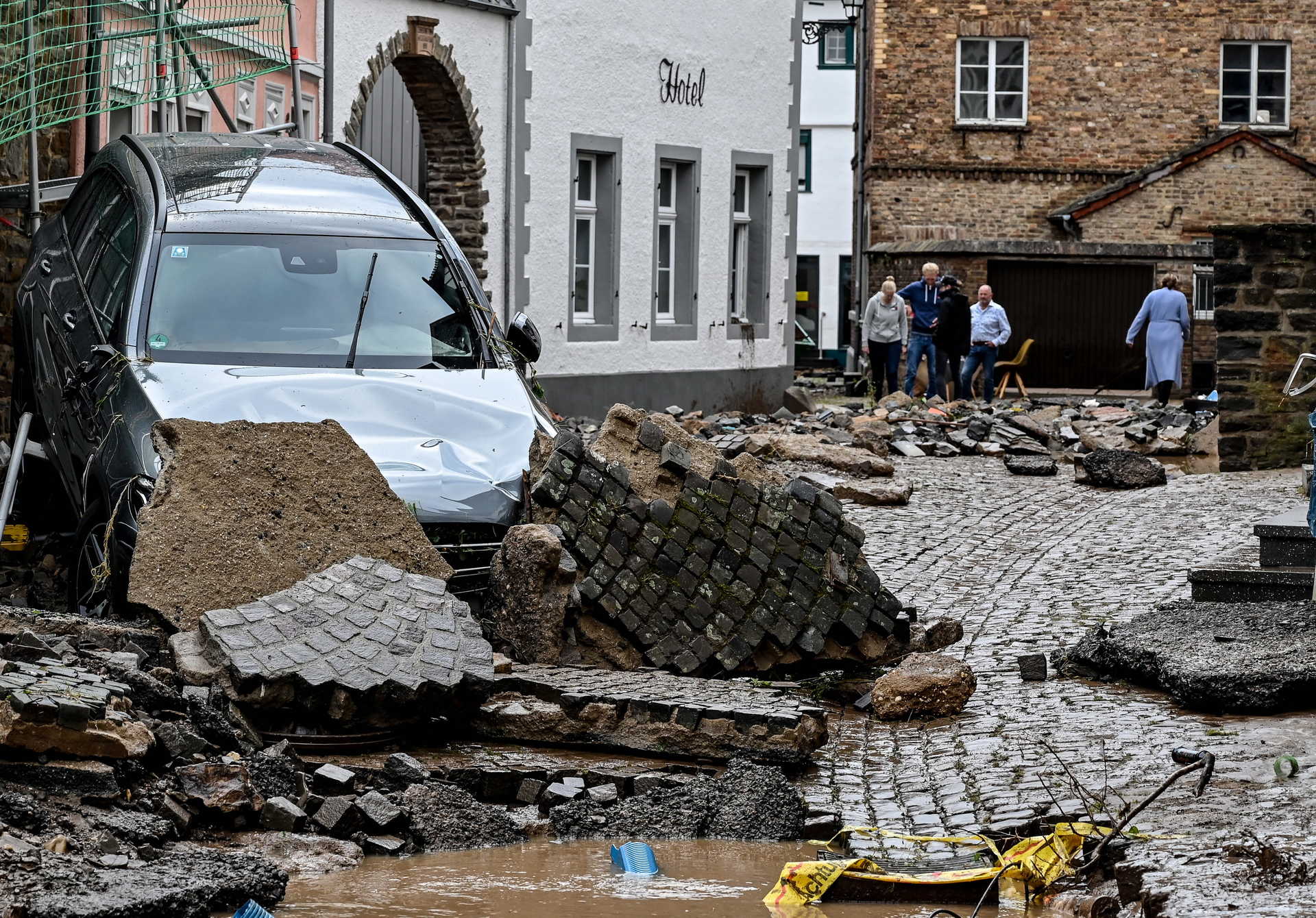 People look a at a destroyed car and other damages caused by the floods of the Volme river on July 15, 2021 in Priorei near Hagen, western Germany, after heavy rain hit parts of the country, causing widespread flooding. – Heavy rains and floods lashing western Germany have killed at least nine people and left around 50 missing, as rising waters led several houses to collapse, police said. (Photo by SASCHA SCHUERMANN / AFP)