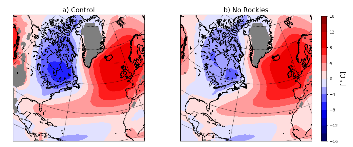 Στο παρακατω διαγραμμα οι Λουτσκο κ.α ετρεξαν ενα GCM μοντελο(GFDL CM2.5-FLOR) με οριζοντια αναλυση 0.5° περιπου για το πως μεταβαλλονται οι θερμοκρασιες εαν τα Βραχωδη Ορη που δεσποζουν σε ολη την δυτικη πλευρα του Καναδα και των ΗΠΑ, γινουν λοφοι των 300 μετρων, εξαφανιστουν ουσιαστικα δηλαδη. Για συγκριση ο Σιγκερ το 2002 ειχε τρεξει εξομοιωσης της κυκλοφοριας με μοντελο οριζοντιας αναλυσης 5° δηλαδη 10 φορες χειροτερης.
