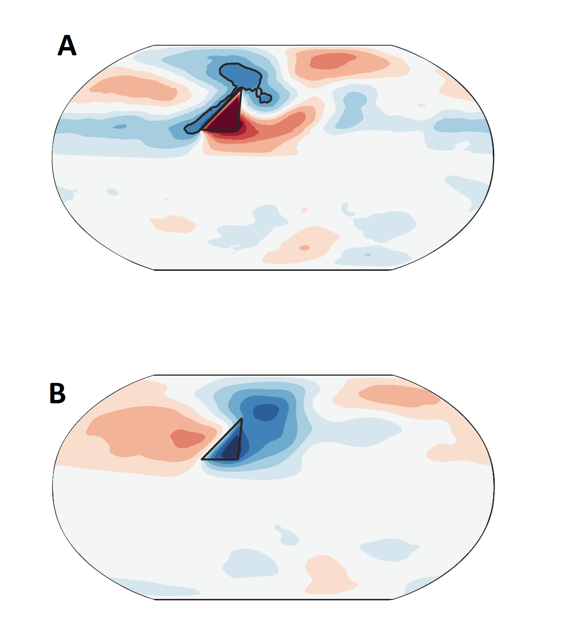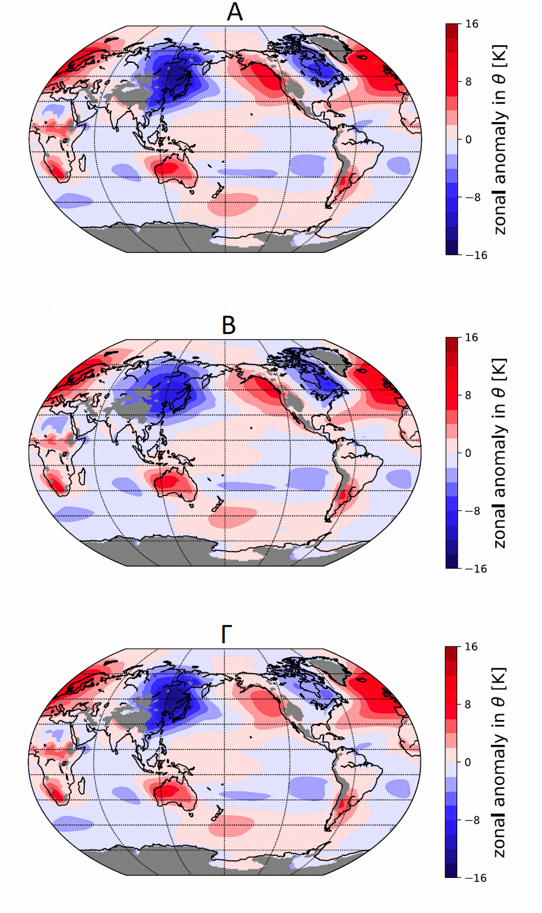 Αναλυτικοτερα, χρησιμοποιωντας ενα πληρες μοντελο γενικης κυκλοφοριας της ατμοσφαιρας(GCM), βρηκαν οτι σε περιπτωσεις μεγαλης θερμανσης θαλασσιων υδατων, οπως πχ συμβαινει στο ζεστο Ρευμα του Κολπου που ρεει κοντα στις ανατολικες ακτες των ΗΠΑ, η αυξηση της θερμοκρασιας του αερα απο πανω απο τα θερμα θαλασσια νερα, προκαλει ενα μεγαλης εκτασης σχεδον στασιμο πλανητικο κυμα, με την μορφη κυκλωνικης ροης στα ανατολικα της θερμης θαλασσιας περιοχης και αντικυκλωνικης ροης στα δυτικα της θερμης θαλασσιας περιοχης, με αμεσο αποτελεσμα την γενικη ροη ψυχροτερων αεριων μαζων απο τα βορεια προς τα νοτια ψυχραινοντας την περιοχη δυτικα της περιοχης των θερμων νερων.