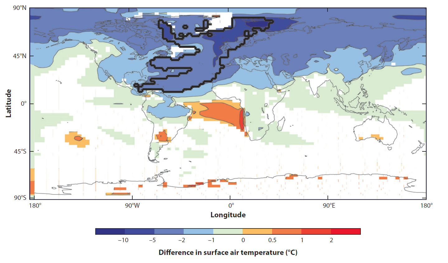 Ειναι φανερη η πολυ μεγαλη ψυχρανση που θα δημιουργουνταν στο βορειο ημισφαιριο, μολις 10 ετη μετα απο την εισαγωγη του γλυκου νερου(απο λιωσιμο των παγων) και την επιβραδυνση του AMOC κατα 70 %.