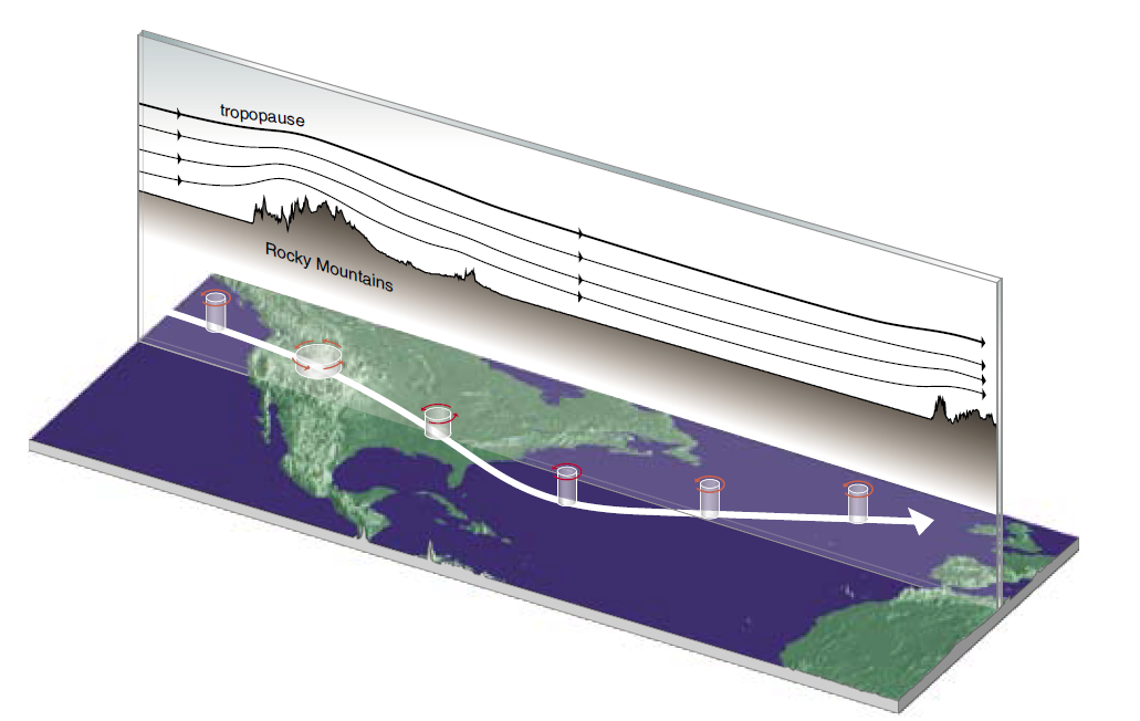 Ετσι η εξηγηση που εδωσαν ηταν οτι τα επιβλητικα Βραχωδη Ορη, η τεραστια οροσειρα με μηκος σχεδον 5000 χιλιομετρων και υψη απο 3000 εως 4400 μετρα που αρχιζει απο Καναδα και διασχιζει με κατευθυνση απο βορρα προς νοτο τα δυτικα τμηματα των ΗΠΑ, δημιουργουν τετοιο μεγαλο εμποδιο στις αεριες μαζες, που αυτες λογω και του οτι η στροφορμη τους πρεπει να διατηρηθει, δημιουργουν εναν κυματισμο που στρεφεται νοτιοτερα μολις περασει την οροσειρα και περιπου στο μεσο του Ατλαντικου ξαναανεβαινει βορεια οποτε και οι οι αεριες μαζες εχουν γενικα αυτη την κινηση οποτε μεταφερουν θαλασσιους ανεμους που θερμαινουν την Ευρωπη στα ψηλα γεωγραφικα πλατη κιολας.