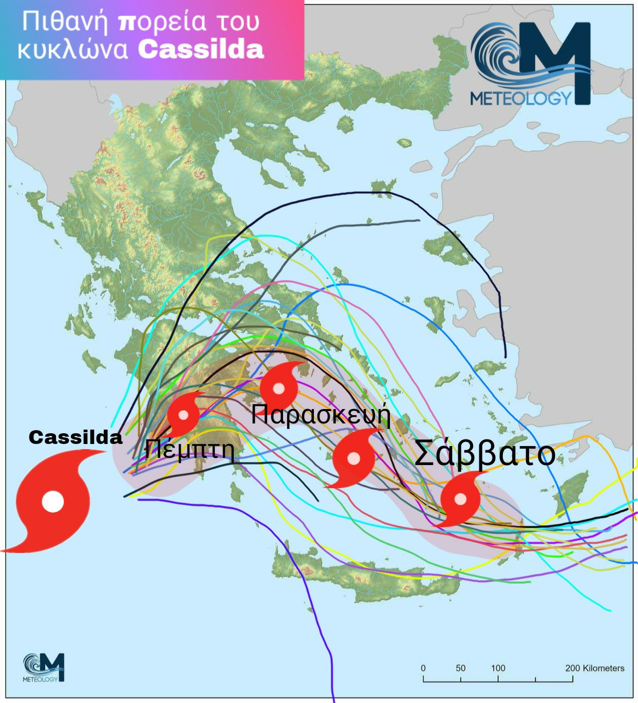 Στον παρακάτω χάρτη, αθροίζονται οι μέσοι όροι τροχιάς της Cassilda σύμφωνα με το σύνολο των προγνωστικών δεδομένων. Παρατηρούμε ότι η πιθανότερη κίνηση είναι από δυτική Πελοπόννησο, Στερεά και Αιγαίο, κυρίως το νότιο. Η τελική τροχιά θα καθοριστεί μέσα στην ημέρα.Η πιθανή πορεία του μεσογειακού κυκλώνα Cassilda , σύμφωνα με το σύνολο των προγνωστικών μοντέλων.