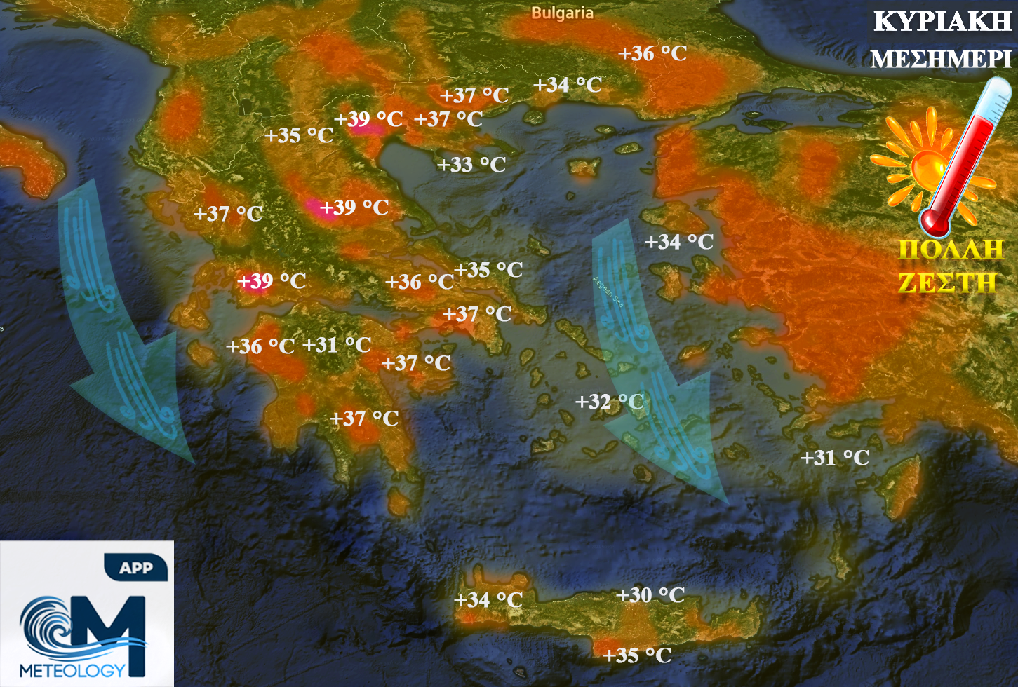 Κορύφωση της θερμής μεταφοράς από την Αφρική, αναμένουμε την Κυριακή σε όλη την χώρα. Σε αυτό θα βοηθήσουν και οι ασθενείς βόρειοι άνεμοι, οι οποίοι θα εξουδετερώσουν τις θαλάσσιες αύρες, έτσι οι υψηλές θερμοκρασίες, θα αφορούν και τις παράκτιες περιοχές. Γενικευμένα 37άρια, 38άρια αλλά ακόμη και 39άρια, θα δούμε το μεσημέρι της Κυριακής από βορρά έως νότο. Παράλληλα θα περιοριστεί και η αστάθεια, με την πιθανότητα για μπόρες, να υπάρχει μόνο στα βόρεια ορεινά. Καυτή η Κυριακή και στη Θεσσαλονίκη, με έναν ασθενή λίβα βαρδάρη, γύρω στα 3 μποφόρ. Ο βοριάς αυτός, θα είναι η αιτία που η θερμοκρασία θα φτάσει ακόμη και τους 39 βαθμούς! Εξίσου ζεστή η Κυριακή και στην Αθήνα, με τον υδράργυρο στους 36 με 37 βαθμούς το μεσημέρι, και έναν ασθενή βόρειο άνεμο, η αιτία που θα ανεβάσει την θερμοκρασία. Υποχώρηση της κάψας θα έχουμε από Δευτέρα, με παράλληλη εκδήλωση ισχυρών καταιγίδων σε πολλές περιοχές.