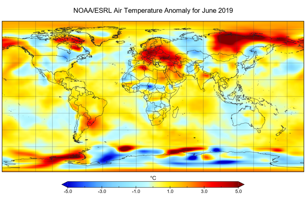 Εδω και ο αντιστοιχος παγκοσμιος χαρτης αποκλισης θερμοκρασιας του φετινου Ιουνιου απο τις κλιματολογικες τιμες της περιοδου 1951-1980 (NOAA/ESRL δεδομενα):