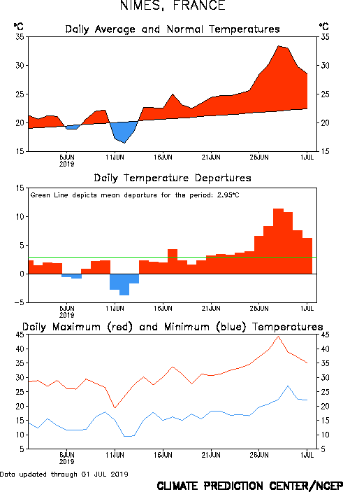 Εδω φαινεται η αποκλιση θερμοκρασιων των τελευταιων 30 ημερων στην Νιμ της Γαλλιας και πόσο ακραιο ηταν το κυμα καυσωνα αλλά και ολος ο Ιουνιος: