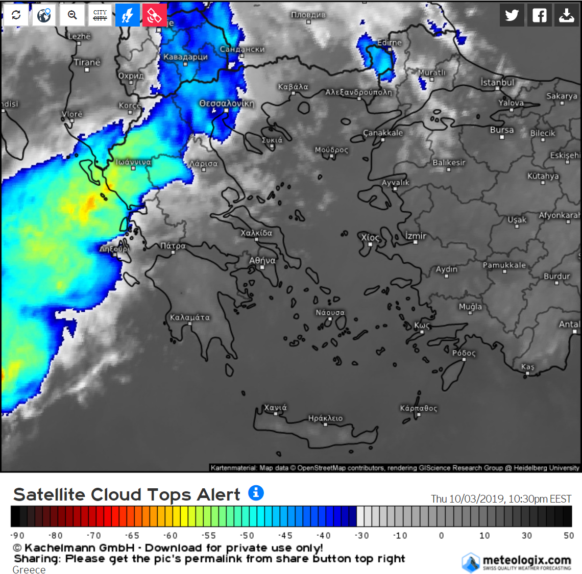 Το σύμπλεγμα αυτό που διακρίνετε στην εικόνα, κινείται αργά ανατολικά, και έτσι αύριο θα πρέπει να περάσει πάνω από την χώρα μας, δίνοντας έντονες καταιγίδες σε πολλές περιοχές, συμπεριλαμβανομένης και της ΑΤΤΙΚΗΣ. Εξίσου μεγάλα ύψη βροχής αναμένονται και στην Θράκη, κυρίως τα δυτικότερα τμήματα, από καταιγίδες που θα έχουν κατά κύριο λόγο ορογραφικό χαρακτήρα. Αυτό σημαίνει, πως οι προσκείμενες στο νοτιά ορεινές περιοχές, θα δεχθούν επίμονες και ισχυρές βροχοπτώσεις ( Ροδόπη), ικανές να προκαλέσουν υπερχυλίσεις χειμάρρων. Στην κεντρική Μακεδονία αλλά και την ανατολική, τα φαινόμενα θα είναι ηπιότερης μορφής και δεν αναμένεται να προκαλέσουν προβλήματα, τουλάχιστον όπως στις προαναφερθείσες περιοχές.