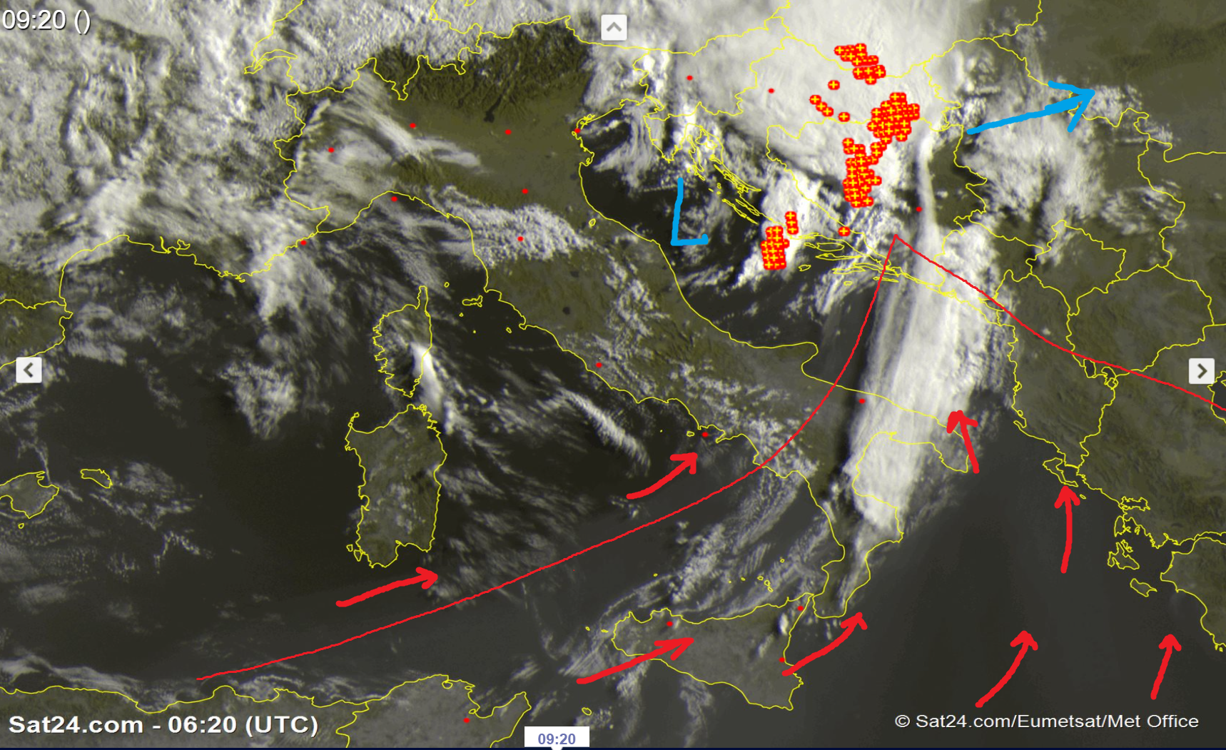 Πολύ ισχυρές καταιγίδες δέχεται η Βαλκανική ( δυτικά) αυτές τις ώρες, καταιγίδες οι οποίες μέχρι αύριο θα έχουν σαρώσει όλες τις περιοχές από Βουλγαρία και πάνω. Το χαμηλάκι αυτό, είναι και η αιτία της σημερινής ανόδου του υδραργύρου, καθώς τραβάει νέα ζέστη και σκόνη ( φαινεται στον δορυφόρο) προς την χώρα μας. Δυστυχώς η τροχιά αυτής της διαταραχής, είναι πολύ βορειότερα από την χώρα μας, έτσι δεν προκειται να μας επηρεάσει στο θεμα των βροχών. Αντίθετα θα μας επηρεάσει ανεμολογικά, καθώς από τις αμέσως επόμενες ώρες, θα ενισχύσει τους ανέμους από ΔΝΔ διευθύνσεις σε πολλές περιοχές, σε εντάσεις 5 ίσως και 6 μποφόρ. Οι άνεμοι αυτοί, θα διαμορφώσουν κατ απόλυτο τρόπο και τις σημερινές θερμοκρασίες, με τα παράκτια τμήματα που ‘βλέπουν’ νότια και δυτικά, να έχουν δροσιά, ενώ αντίθετα περιοχές που βλέπουν ανατολικά και βρίσκονται ανατολικά της Πίνδου, θα δούνε για ακόμη μια μέρα μεγάλες μέγιστες ( ισως και πανω απο 44 βαθμούς) τοπικά. Το ψυχρό μέτωπο αυτής της διαταραχής, θα έρθει στην χώρα μας από αύριο το μεσημέρι, αλλά καθώς ο ατμοσφαιρικός αέρας θα έχει εξαιρετικά χαμηλά ποσοστά υγρασίας, δεν αναμένεται να προκαλέσει σχηματισμό καταιγίδων. Σε αυτό βέβαια θα συμβάλει και το οτι οι άνεμοι ήδη από αύριο πρωί, θα είναι ΔΒΔ, έχοντας ρίξει κατακόρυφα τις υγρασίες. Αν είχαμε θαλάσσιες αύρες, αύριο θα μιλούσαμε για εκρηκτικές καταστάσεις. Το μόνο λοιπον που θα κανει το μέτωπό της, είναι να προκαλέσει ακόμη περισσότερα προβλήματα στις περιοχές που καίγονται, καθώς θα ρίξει ακόμη περισσότερο την υγρασία και θα ενισχύσει ακόμη περισότερο τους ανέμους, αρχικά από δυτικές διευθύνσεις, και προοδευτικά σε βορειότερες συνιστώσες.