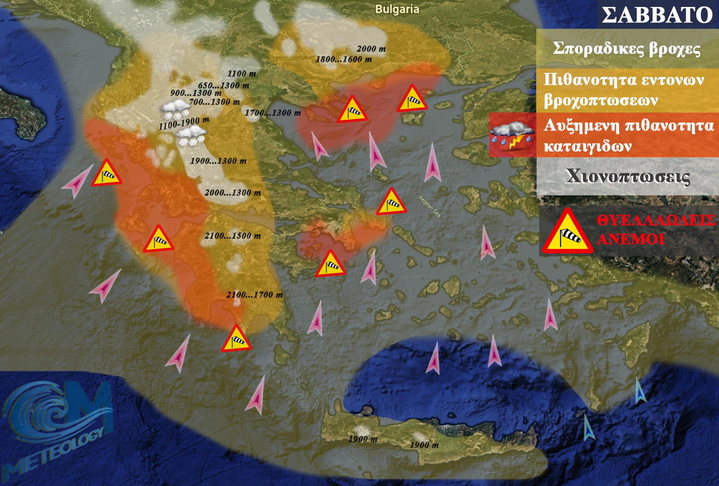 Ημέρα κακοκαιρίας το Σάββατο σε πολλές περιοχές της χώρας μας. Θυελλώδεις νοτιάδες στα πελάγη, με έμφαση το Αιγαίο όπου τοπικά θα φτάσουν και τα 10 μποφόρ αλλά και ισχυρές βροχές στα δυτικά και το ανατολικό Αιγαίο. Στον παρακάτω χάρτη, βλέπετε τις καιρικές συνθήκες που θα επικρατούν μέχρι το βράδυ της ίδιας μέρας στην χώρα μας.