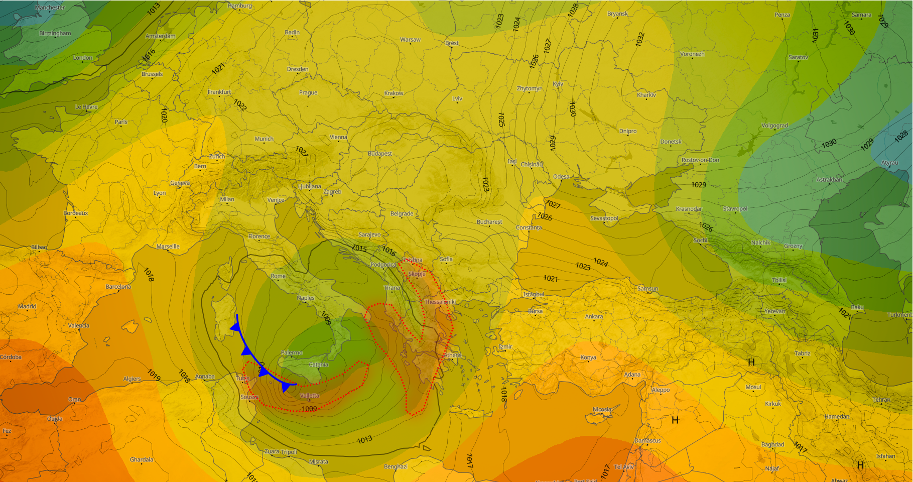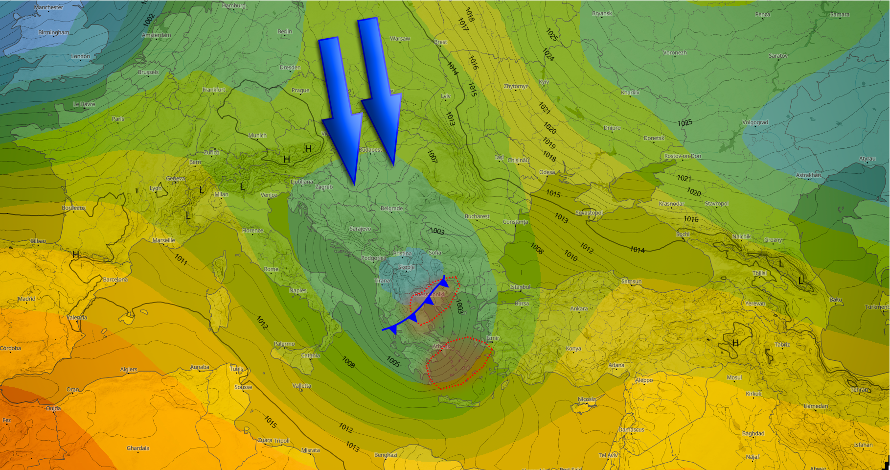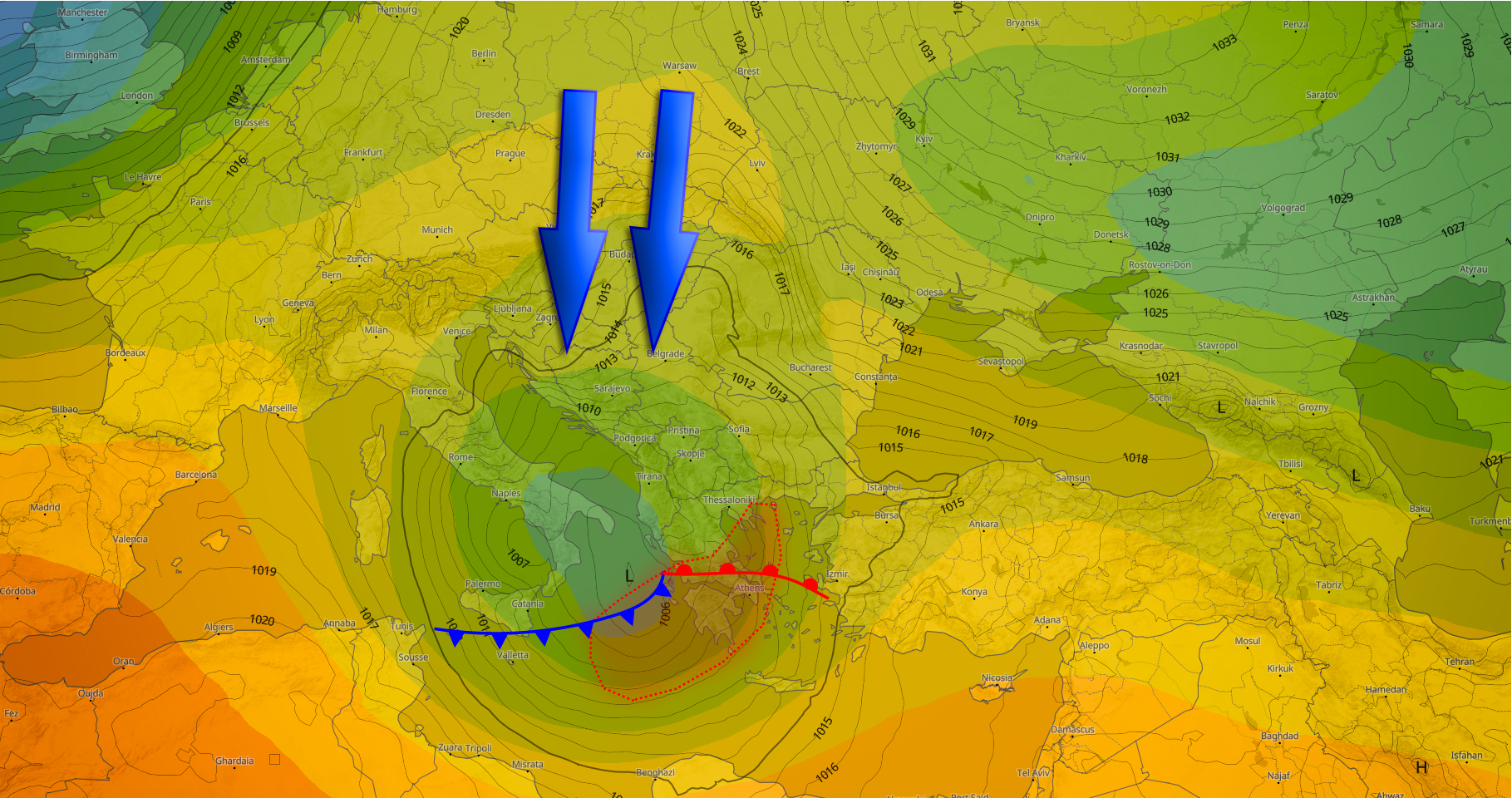Βλεπουμε τωρα μια πολυ πιο κλασικη κατασταση κακοκαιριας, αυτην που δινει συνηθως και τις μεγαλυτερες βροχες και καταιγιδες το φθινοπωρο για το συνολο της Ελλαδας. Αυλωνας που κατερχεται ειτε απο τα βορεια ειτε απο τα βορειοανατολικα και καταληγει στην Αδριατικη/Ιονιο αποκοπτοντας ενα τμημα του δημιουργωντας μια ψυχρη λιμνη. Σε αυτην την περιπτωση δημιουργουνται και ψυχρο μετωπο και θερμο που συνοδευουν το χαμηλο βαρομετρικο που θα δημιουργηθει και και τα 2 μετωπα θα επηρεασουν σε μεγιστο βαθμο την Ελλαδα.