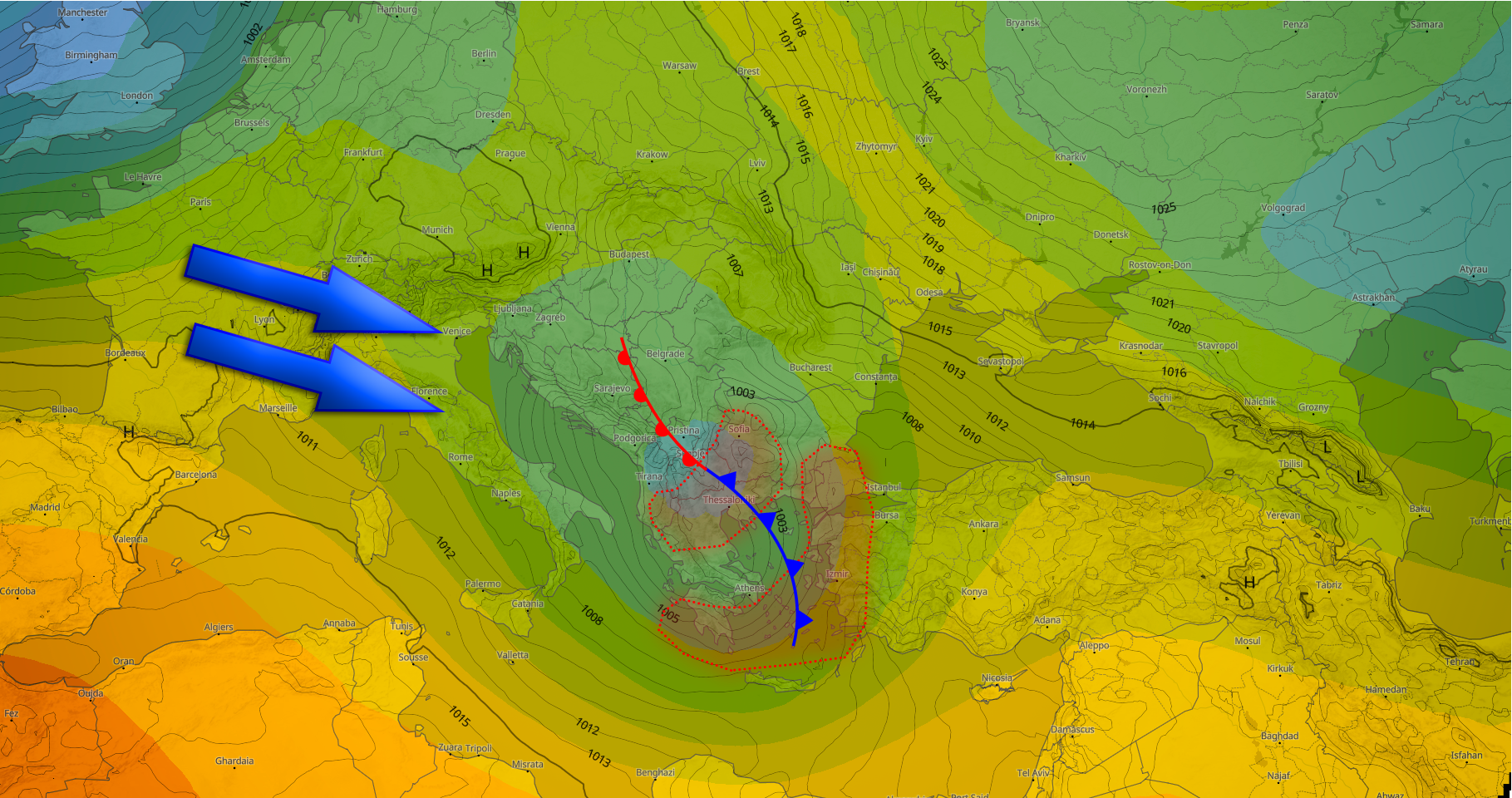 Ενω αναλογως της κινησεως του, δημιουργειται το φθινοπωρο και τον χειμωνα ψυχρο μετωπο αλλά και αρκετες φορες και θερμο αναλογως.