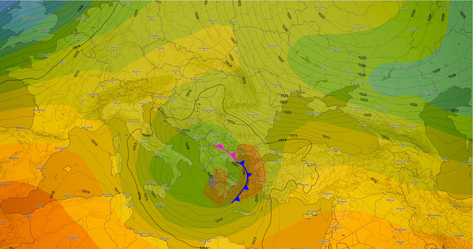 Κατα την κινηση του αυλωνα ανατολικοτερα, πολυ πιθανο να δημιουργουνταν και συνεσφιγμενο μετωπο(με μωβ) στα βορεια ενω η γραμμη καταιγιδων θα συνεχιζε την πορεια της και στο Αιγαιο αφου ειχε ηδη περασει απο την ηπειρωτικη Ελλαδα δινοντας βροχες και καταιγιδες.