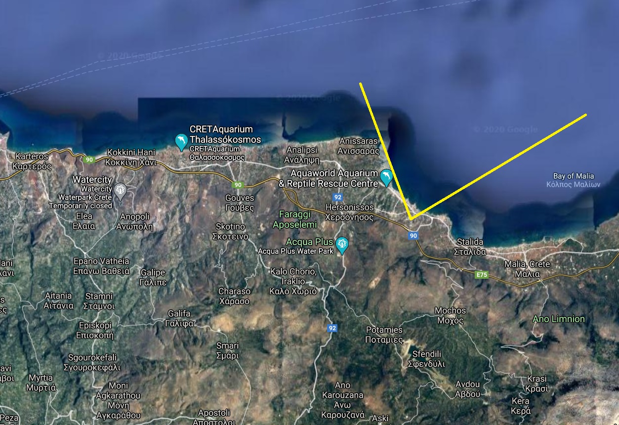 View from Chersonesos, Crete. The camera is located at the Imperial Belvedere Hotel and looks north-north east and the entire Chersonesos beach is visible. On the left there is Chersonesos port, the Gulf of Sarantari and the cape of Anisara, with the chapel of Saint George