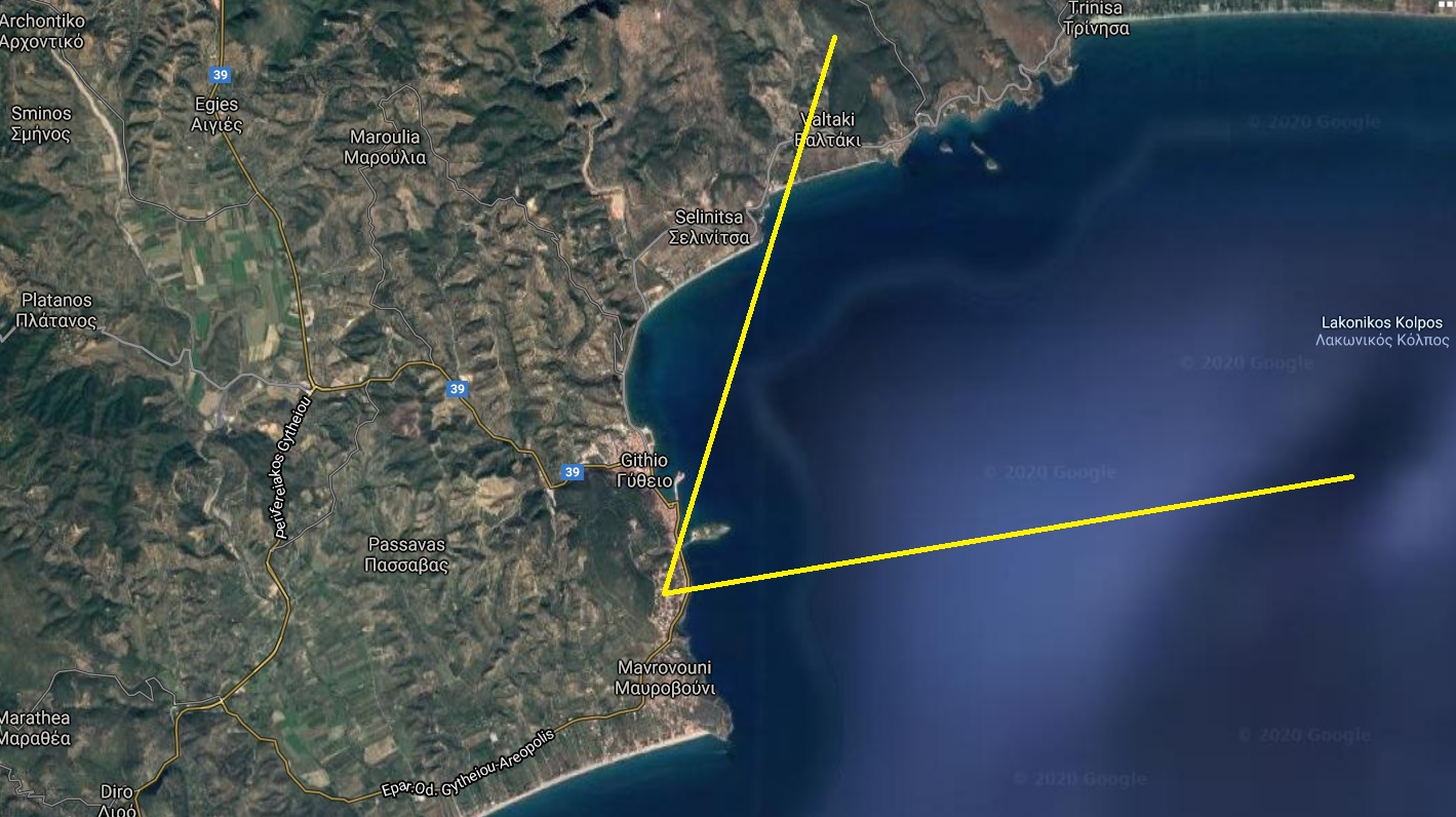 Η κάμερα κοιτάει Βορειοανατολικά με θέα τον Λακωνικό κόλπο και τις εκβολές του ποταμού Εύρωτα.