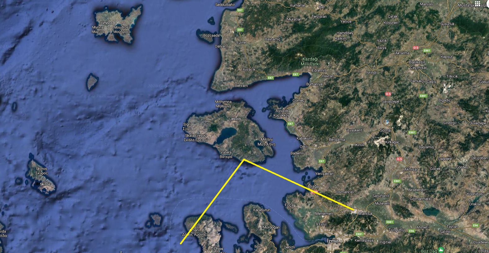 Η κάμερα είναι τοποθετημένη στο Πλωμάρι Λέσβου, στην νότια πλευρά του νησιού, με κατεύθυνση νότιο νοτιοανατολική, ενώ στο βάθος δεξιά διακρίνεται η Χίος και τα παράλια της Σμύρνης.
