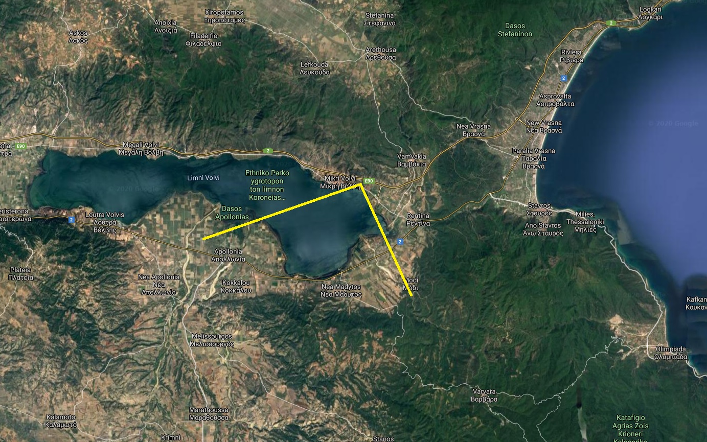 The camera is located on the northwest shore of the Lake, in the village of Mikri Volvi of the Municipality of Volvi, with a southwestern image direction, while opposite are the villages of Nea Madytos from the left and in the middle Kokkalou and Nea Apollonia. Lake Volvi is the 2nd largest lake in Greece with an area of 70.8 square kilometers and the largest in Macedonia.