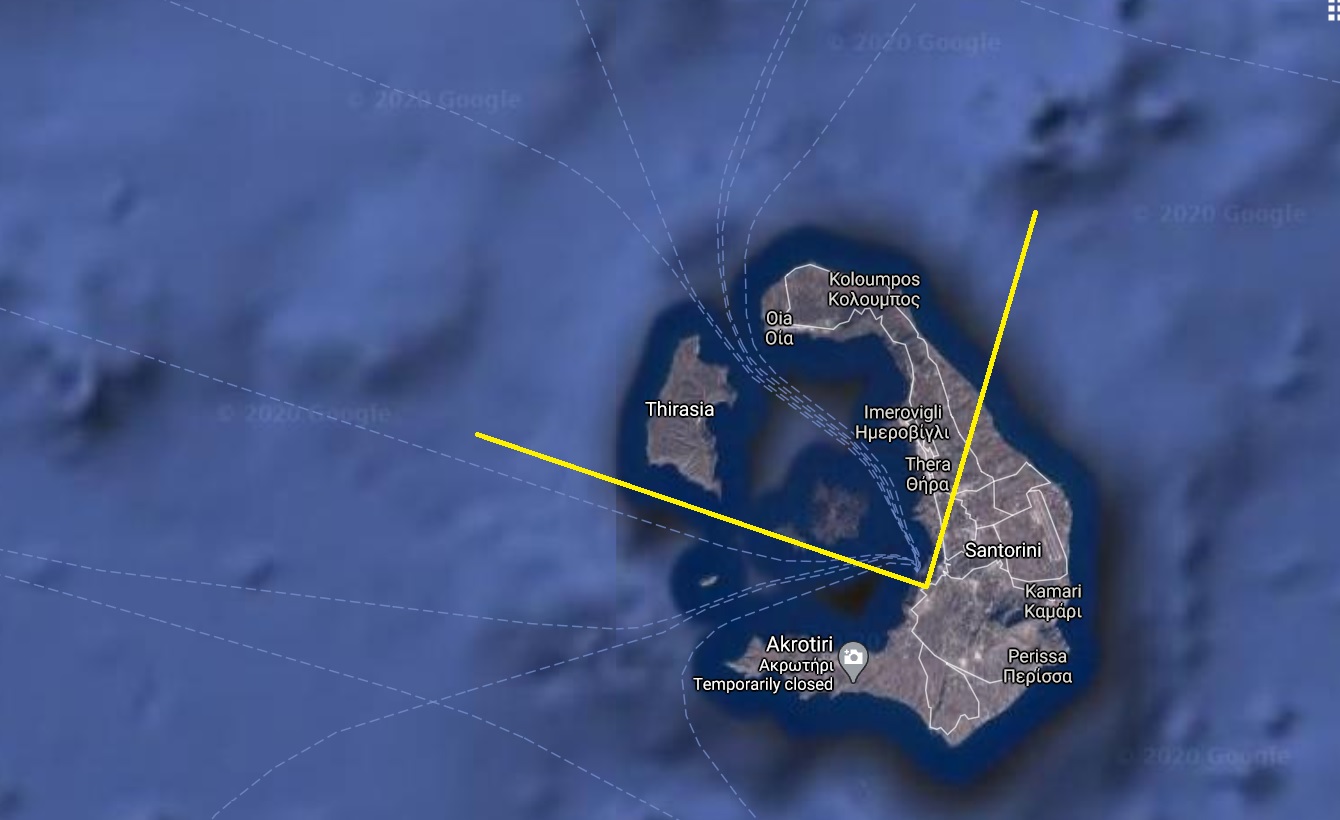 Η κάμερα είναι τοποθετημένη στο Μεγαλοχώρι Σαντορίνης με κατεύθυνση εικόνας βορειοδυτική. Στο βάθος αριστερά διακρίνεται το νησάκι του ηφαιστείου, και πιο πίσω βλέπουμε το νησί Θηρασία. Στην δεξιά πλευρά διακρίνεται η Θήρα, το Ημεροβίγλι και η Οία με το βόρειο ακρωτήρι. Επίσης έχουμε εικόνα και από το νέο λιμάνι του νησιού.