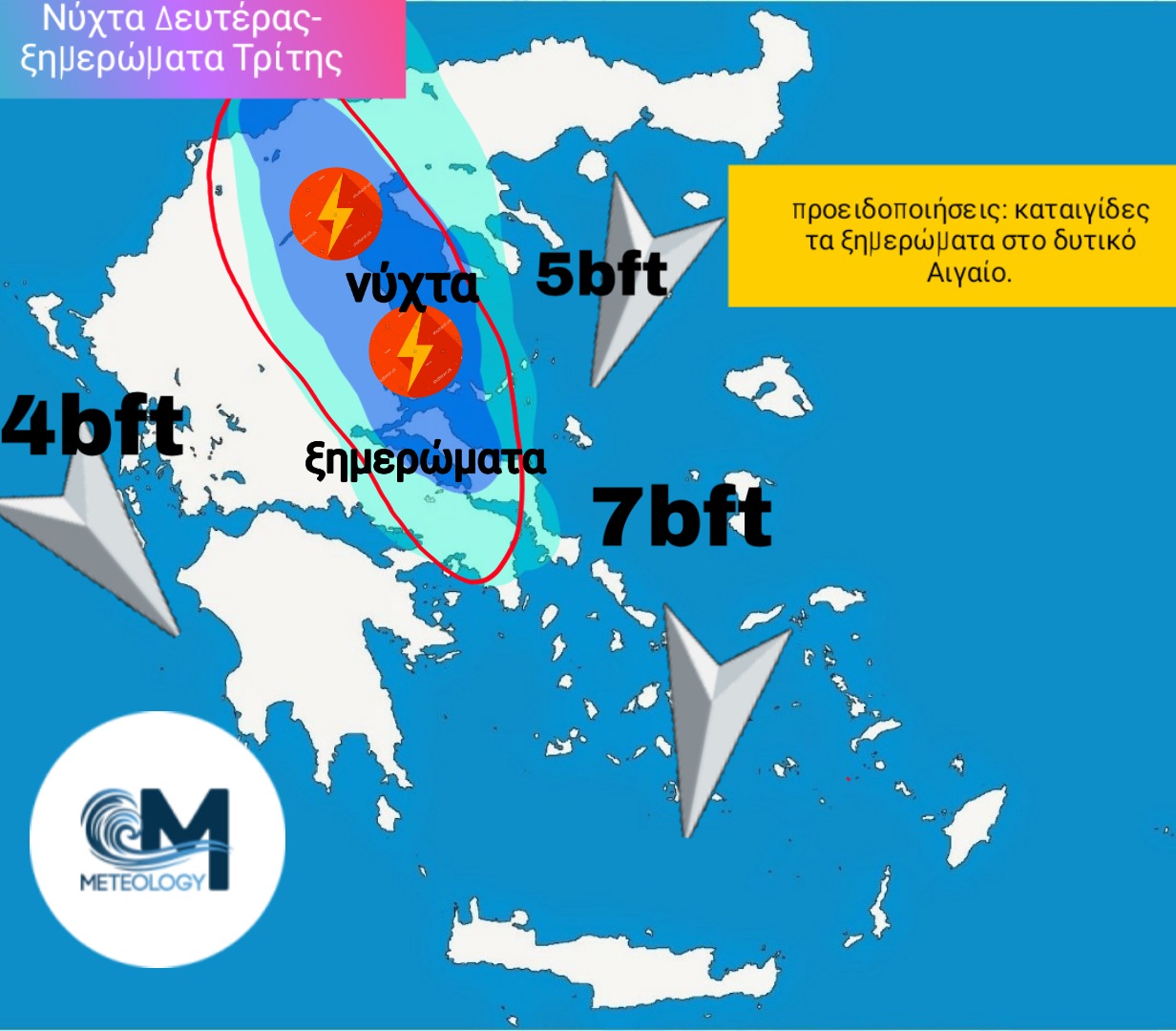 Πρόσκαιρη αλλαγή του καιρού τις επόμενες ώρες στα δυτικά τμήματα του Αιγαίου, από το ύψος περίπου της Εύβοιας και μέχρι τις ακτές Θερμαϊκού. Από τα μεσάνυχτα της Δευτέρας προς Τρίτη μέχρι τα ξημερώματα, θα εκδηλωθούν Διάσπαρτες μπόρες και τοπικές καταιγίδες. Τα φαινόμενα, δεν αποκλείεται πρόσκαιρα να έχουν έντονο χαρακτήρα. Βελτίωση του καιρού από το πρωί και έπειτα με τον άστατο καιρό να εντοπίζεται σε Θράκη και Στερεά.