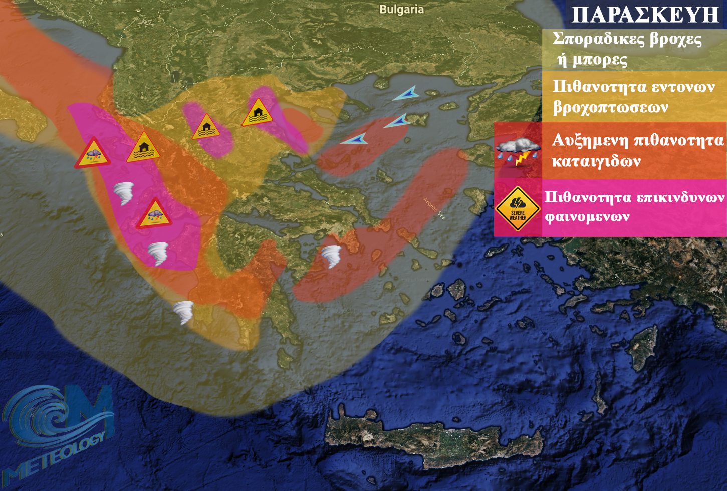 Μπόρες βροχές και τοπικές καταιγίδες, σε πολλές περιοχές της χώρας αναμένουμε την Παρασκευή. Τα εντονότερα φαινόμενα θα εστιάζονται στην δυτική χώρα ( εδώ θα υπάρχουν όμως και διαστήματα ηλιοφάνειας), στα δυτικότερα τμήματα της κεντρικής Μακεδονίας, τμήματα της δυτικής καθώς και σε Αττική και κεντρικό Αιγαίο. Στην Αττική συγκεκριμένα, περιμένουμε μέσα στην ημέρα, αξιόλογο πέρασμα βροχών και καταιγίδων, με μικρή αλλά υπαρκτή πιθανότητα, τα φαινόμενα να έχουν ένταση. Δεν αποκλείεται, σχηματισμός υδροστροβίλων στον Σαρωνικό. Τονίζω επίσης τις περιοχές σε ανατολική Θεσσαλία μέχρι περίπου την Ημαθία-Πέλλα, όπου και εδώ, για αρκετές ώρες θα έχουμε ραγδαίες βροχοπτώσεις. Στην υπόλοιπη χώρα, η συννεφιά θα δίνει διάσπαρτες τοπικές βροχές.