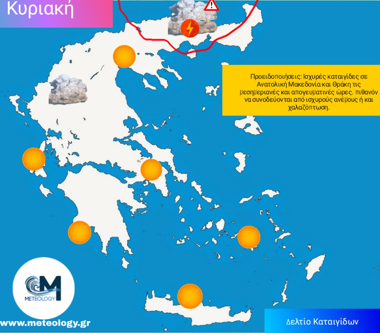 Ο άστατος καιρός, επιμένει και μέσα στην Κυριακή σε ανατολική Μακεδονία και Θράκη. Μάλιστα σε σχέση με το Σάββατο, φαίνεται πως οι συνθήκες είναι ευνοϊκότερες για εκδήλωση απογευματινών, γενικευμένων καταιγίδων σε πολλές περιοχές των προαναφερθέντων διαμερισμάτων. Αξίζει να τονιστεί πως οι καταιγίδες αυτές θα έχουν ένταση και ενδεχομένως να συνοδεύονται από ισχυρούς ανέμους και χαλαζόπτωση. Υπαρκτή η πιθανότητα, το απόγευμα, οι καταιγίδες αυτές εξασθενούμενες, να επηρεάσουν και τα παράκτια τμήματα με την μορφή μπουρινιών. Στην υπόλοιπη χώρα, ο καιρός παραμένει βελτιωμένος και ζεστός.