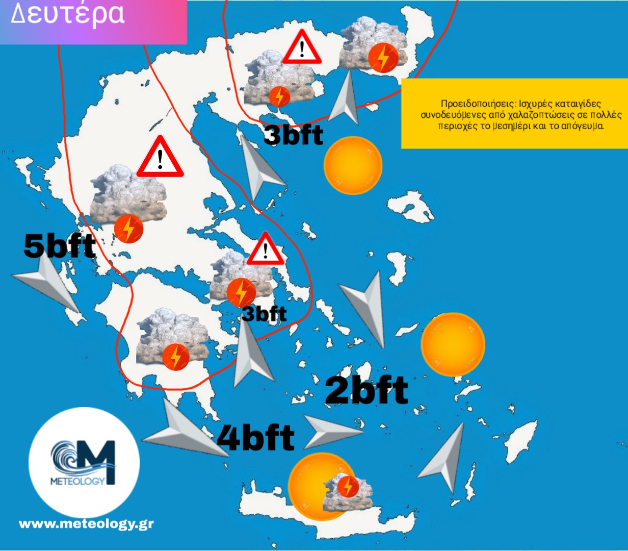 Συνθήκες έντονης αστάθειας σε πολλές περιοχές της χώρας μας μέσα στην Δευτέρα. Μεσημεριού και Απογευματινού τύπου μπόρες και τοπικές καταιγίδες θα εκδηλωθούν στα ηπειρωτικά τμήματα και όχι μόνο. Τα φαινόμενα θα είναι τοπικά έντονα, συνοδευόμενα από χαλάζι και ισχυρούς ανέμους. Καταιγίδα και στην Αθήνα την Δευτέρα, η οποία ενδεχομένως να είναι ισχυρή! Στην Θεσσαλονίκη, η πιθανότητα σύντομης μπόρας είναι μικρή αλλά υπαρκτή το μεσημέρι και το απόγευμα, κυρίως στα γύρω ορεινά.