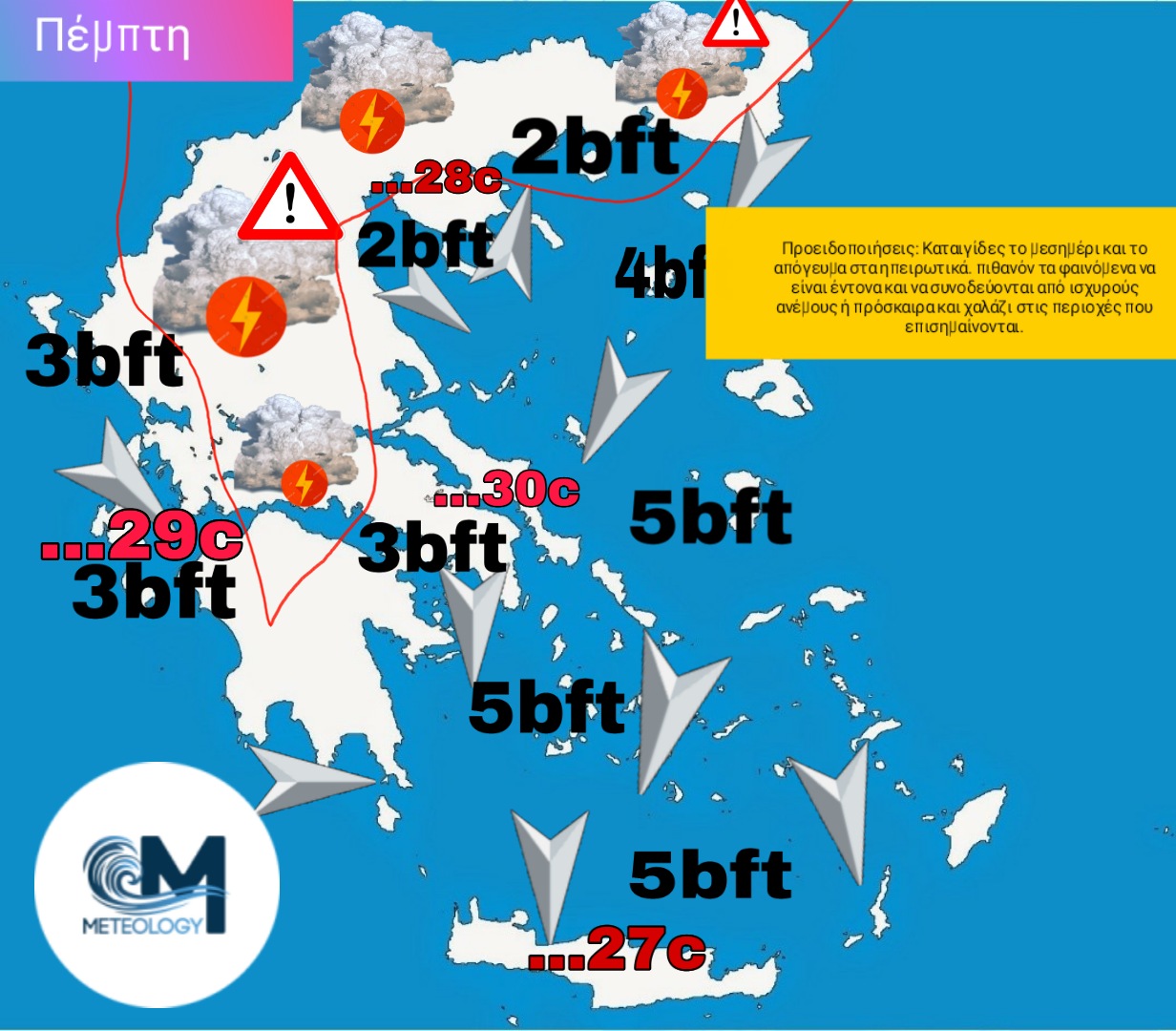 Εντείνεται η αστάθεια μέσα στην Πέμπτη στα κεντρικά και βόρεια ηπειρωτικά τμήματα. Κλασικά, το μεσημέρι και το απόγευμα, συννεφιές θα πυκνώσουν και θα δώσουν μπόρες και τοπικές καταιγίδες στις περιοχές που τονίζονται στον χάρτη. Αυξημένη η πιθανότητα οι καταιγίδες αυτές να περπατήσουν μέχρι και τα παράκτια τμήματα της Μακεδονίας και της Θράκης, με την μορφή μπουρινιών το απόγευμα κυρίως. Προς το βράδυ πάντως ο καιρός θα καθαρίσει παντού. Νοτιότερα, η πιθανότητα μπόρας περιορίζεται κυρίως στα ορεινά τμήματα. Αυξημένη η πιθανότητα σύντομης μπόρας η και καταιγίδας την Πέμπτη και στη Θεσσαλονίκη, κυρίως στα γύρω ορεινά. Ένα άλλο χαρακτηριστικό είναι η σταδιακή ενίσχυση των βοριάδων στο Αιγαίο ( μελτέμι) οι οποίοι προς το απόγευμα θα φτάνουν και τα 6 μποφόρ. Βοριάς και στην Αττική, στα 3-5 μποφόρ. Η θερμοκρασία χωρίς αξιόλογη μεταβολή.