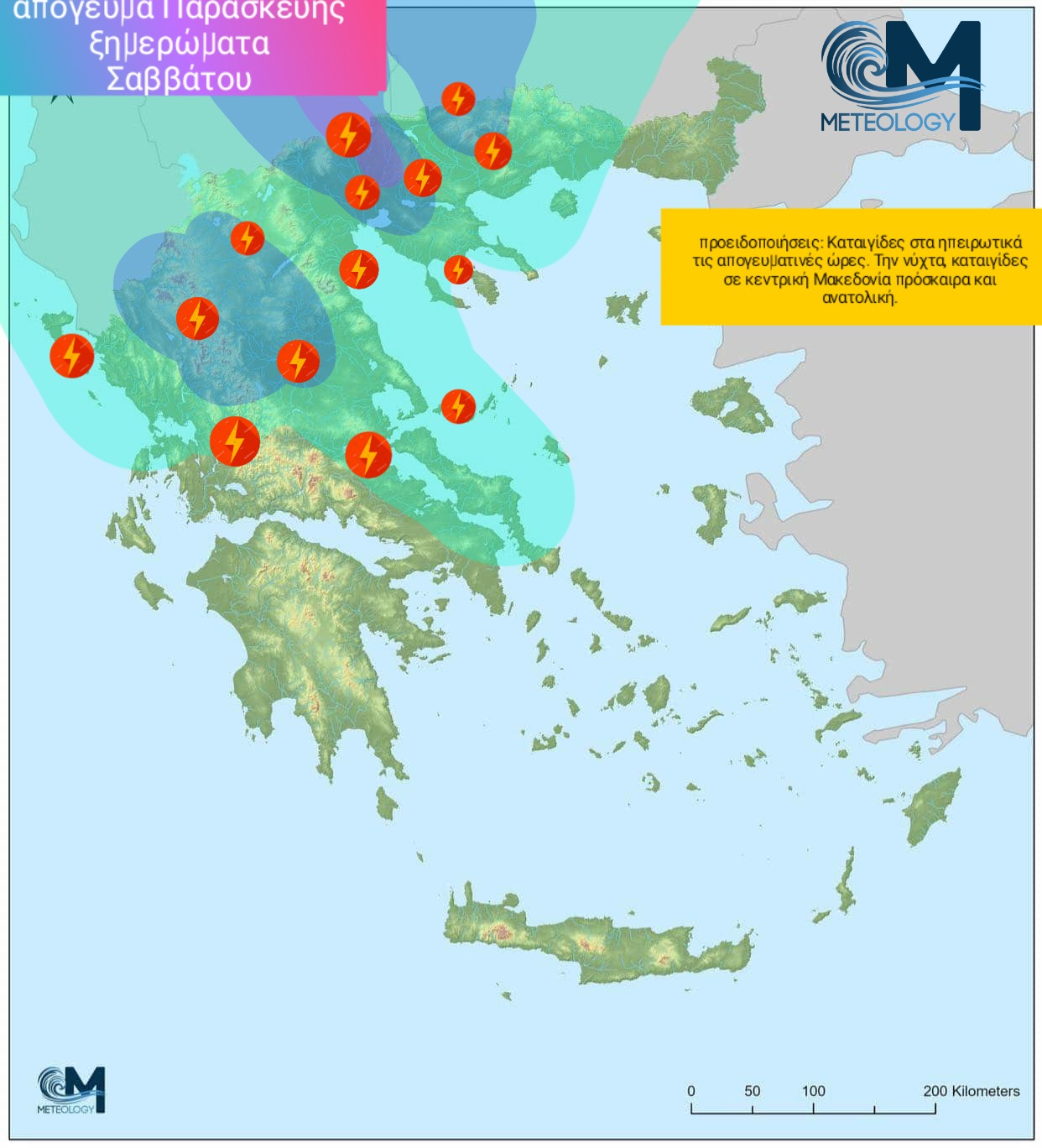 Συνεχίζεται ο άστατος καιρός και μέσα στην Παρασκευή. Όπως βλέπουμε και στον χάρτη, τις απογευματινές ώρες, θα εκδηλωθούν μπόρες και τοπικές καταιγίδες στις περιοχές που τονίζονται με τους χρωματισμούς. Περισσότερα τα φαινόμενα σε Δυτική Μακεδονία, εσωτερικό θεσσαλιας και μέρος της ανατολικής Μακεδονίας. Την νύχτα θα έχουμε και πάλι νέο γύρο βροχοπτώσεων στην κεντρική Μακεδονία, με έμφαση το εσωτερικό του διαμερίσματος. Καταιγίδες και στη Θεσσαλονίκη εκ νέου την νύχτα. Στην Αττική περιμένουμε μπόρες και τοπικές καταιγίδες μέσα στο Σαββατο, σε πολλές περιοχές του νομού!