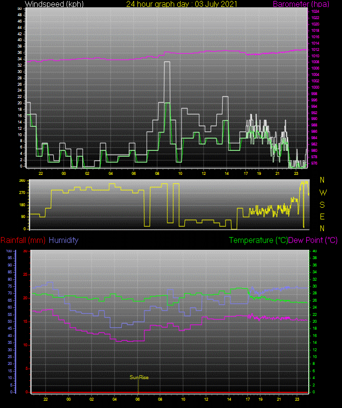 Maximum windspeed 14.8 kmh from 135°(SE) on 03 at 18:34