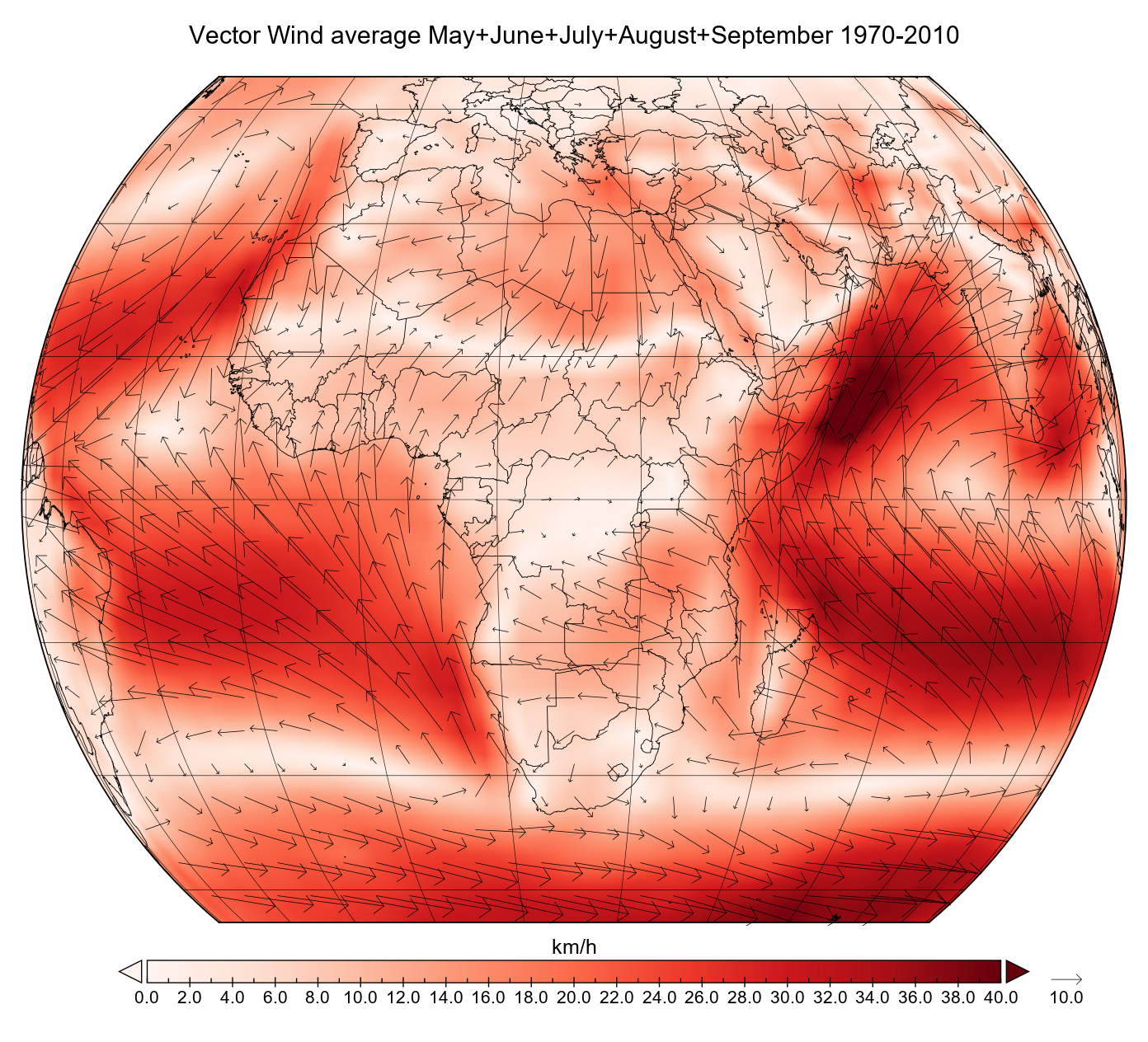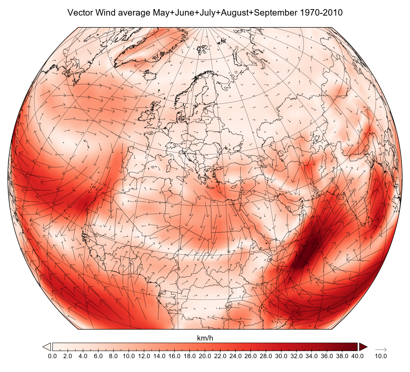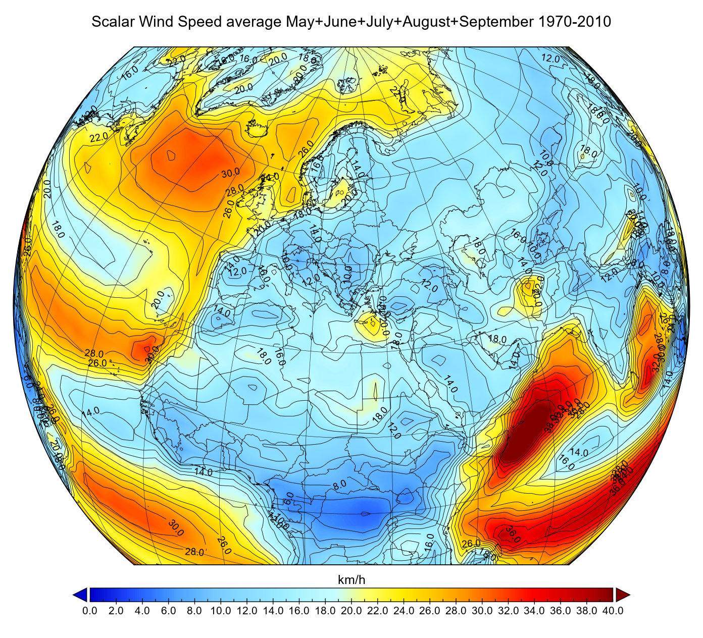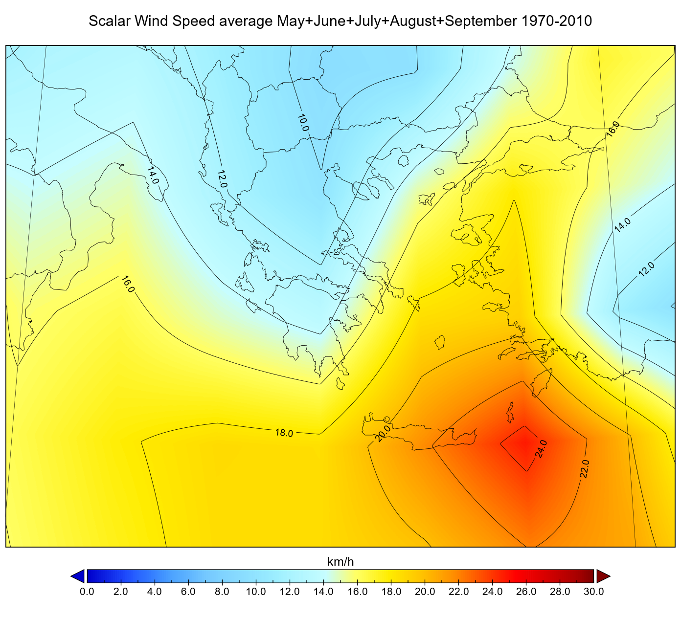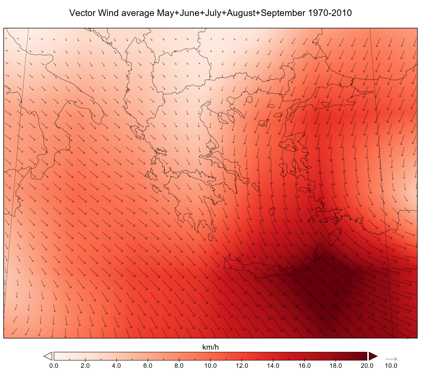 Το ιδιο και εδω, οι ανεμοι που επικρατουν στην Ελλαδα αλλά για τους 5 μηνες της θερινης περιοδου(κλιματολογια περιοδου 1970 εως 2010) και ως μεσες τιμες εντασεως ανεμου(scalar wind) και ως μεσες τιμες του διανυσματικου ανεμου(vector wind).