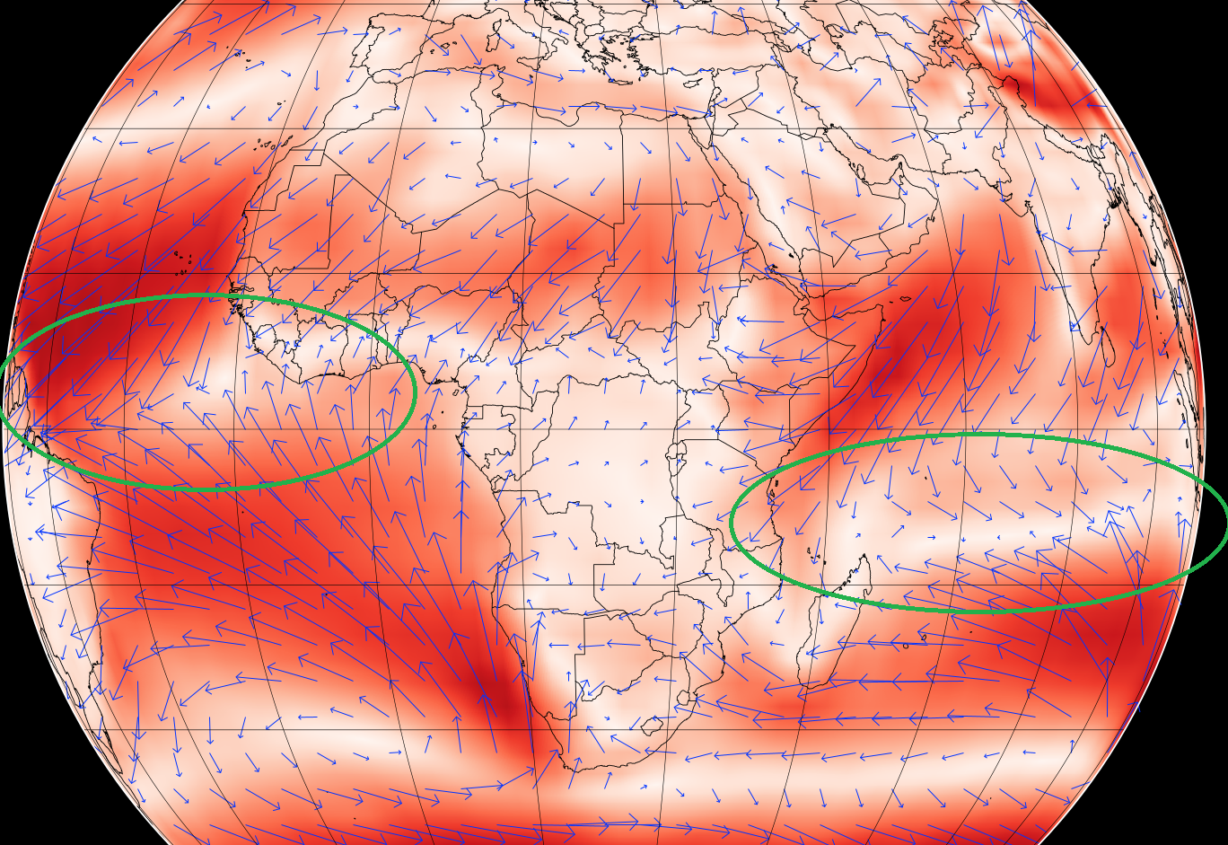 Ειναι φανερη η συγκλιση(περιοχες κυκλωμενες με πρασινο στην παρακατω εικονα) των λεγομενων αληγων ανεμων γυρω απο τον ισημερινο, στο βορειο ημισφαιριο εχοντας κατευθυνση γενικα ΒΑ και στο νοτιο ΝΑ, επιφερουν μια περιοχη σχεδον μονιμων συγκλισεων(που αλλαζει θεση βεβαια κατα καιρους και αναλογως με την εποχη καθως και αλλων ατμοσφαιρικων φαινομενων) που ονομαζεται ενδοτροπικη ζωνη συγκλισης(intertropical convergence zone ή ITCZ) στην οποια επικρατουν διαρκως ανοδικες κινησεις οποτε σχηματιζονται συνεχως νεφωσεις φερνοντας στις περιοχες που επηρεαζουν, παρα παρα πολλες βροχες. Η ενδοτροπικη ζωνη ηταν εφιαλτης για τους πολυ παλιους ναυτικους, καθως ειναι περιοχη μεγαλων νηνεμιων, χωρις ανεμους δηλαδη, οποτε ηταν δυσκολο τα καραβια με μεγαλα καταρτια να μετακινηθουν.
