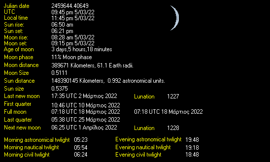 Moonrise: 08:28 (05/03/2022) Moonset: 21:15 (05/03/2022) Waxing Crescent 11% Illuminated |
