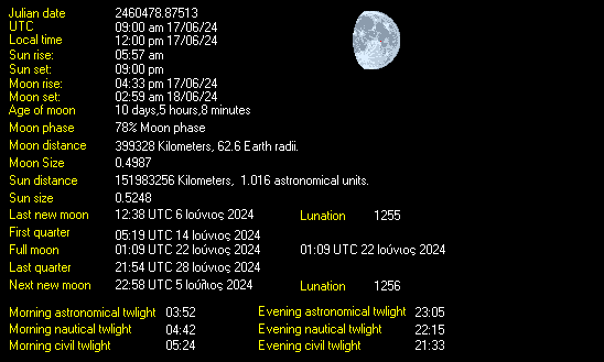 Ανατολή Σελήνης: 17:38 (18/06/2024) Δύση Σελήνης: 02:59 (18/06/2024) Αυξάνουσα Σελήνη 88% Φωτεινότητα |