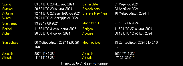 | Ανατολή: 05:57 Δύση: 21:00 Φώς ημέρας: 15:03 |