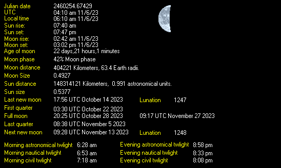 Moonrise: 02:42 (11/06/2023) Moonset: 15:02 (11/06/2023) Waning Crescent 42% Illuminated |