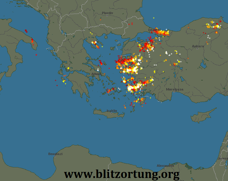 Εικονα ηλεκτρικων εκκενωσεων(κεραυνοι και αστραπες) το πρωι οπου φαινονται οι γενικευμενες καταιγιδες που επληξαν την περιοχη Λερου και οχι μόνο.