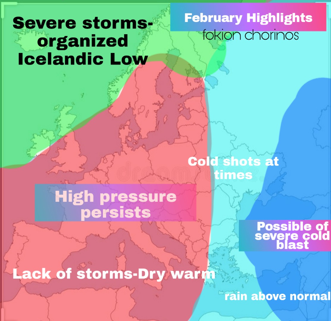 Παρά την πρόσκαιρη εξασθένηση του Ισλανδικού Χαμηλού – το οποίο φέτος μας στέρησε τον χειμώνα- τις πρώτες μέρες του μήνα, αυτό φαίνεται να ενισχύεται σημαντικά εκ νέου, οδηγώντας τις υψηλές πιεσεις που θα αναπτυχθούν στον βόρειο Ατλαντικό, πάνω από την κεντρική Ευρώπη. Η θέση αυτή του αντικυκλώνα, θα θυμίζει πολύ τον Γενάρη, μπλοκάροντας την Ατλαντική ροή , φέρνοντας συνθήκες ξηρασίας και υψηλών θερμοκρασιών σε πολλές περιοχές. Εντούτοις, η θέση του, θα ευνοήσει την ροή ψυχρών αερίων μαζών, από το εσωτερικό της Ρωσίας προς την Μαύρη θάλασσα. Στις περιοχές που βρέχονται από αυτήν, θα πρέπει να τοποθετείται το υψηλότερο ρίσκο για μια σοβαρή πολική εισβολή τις επόμενες εβδομάδες.