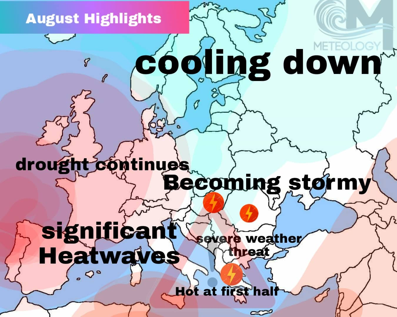 Οι μεγάλες ζέστες του Ιουλίου, θα δώσουν την θέση τους σε μάλλον κρύο καιρό, με αρκετές βροχές σε πολλές χώρες των ανατολικών κυρίως τμημάτων. Μάλιστα, φαίνεται πως το κρύο θα είναι τέτοιο (σε Σκανδιναβικές χώρες) όπου θα πέσουν και τα πρώτα πυκνά χιόνια στα βουνά της Σουηδίας και της Νορβηγίας. Η χώρα μας, φαίνεται πως θα βρεθεί, για κάποιες μέρες, στο σημείο τομής αυτών των αερίων μαζών. Πολύ θερμές και υγρές από την Μεσόγειο, και σχετικά ψυχρές, από τα Βαλκάνια.Μάλιστα, η βαρομετρική διάταξη, όπως θα εξελιχθεί στην Ευρώπη, θα αφήσει ανοικτό το ενδεχόμενο, να μας απασχολήσει μία ή και περισσότερες διαταραχές, φέρνοντας καταιγίδες. Η προυπάρχουσα όμως ζέστη, θα δώσει στις διαταραχές μεγάλους δείκτες διαθέσιμης ενέργειας, έτσι αυτές, πολύ πιθανόν, να δώσουν ακραίες καταιγίδες στα ηπειρωτικά και όχι μόνο.