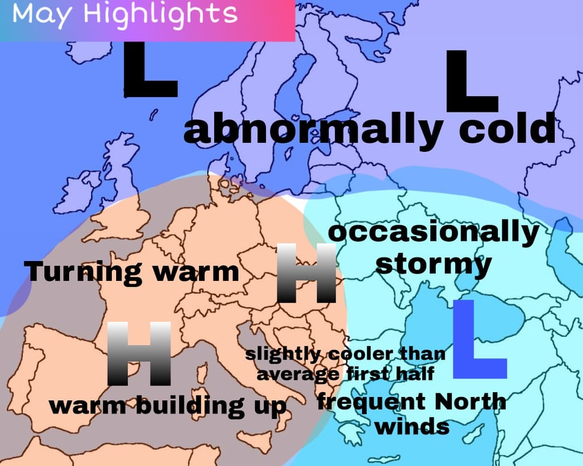 Ψυχρός έως αρκετά ψυχρός, ξεκινάει ο Μάης στο σύνολο της χώρας, καθώς υψηλές πιέσεις στην δυτική Ευρώπη, έχουν στρέψει την ροή των ανέμων σε βοριάδες, στα Βαλκάνια και την χώρα μας. Οι βοριάδες αυτοι, έφεραν και κάποιες μικροδιαταραχές, οι οποίες έδωσαν τοπικά φαινόμενα. Η βαρομετρική αυτή ροή, φαίνεται πως θα είναι κυρίαρχη τουλάχιστον μέχρι τα μισά του μήνα. Πρακτικά λοιπόν, δεν θα πρέπει να περιμένουμε καμία αξιοσημείωτη μεταβολή στη θερμοκρασία, παρότι αυτή θα επιστρέψει στα νορμάλ της εποχής, χωρίς όμως να ξεπερνά τους μέσους όρους. Σε καμία περίπτωση δεν διαφαίνεται κάποιο θερμό, καλοκαιρινό κύμα, στο πρώτο μισό του μήνα. Όπως εύλογα γίνεται αντιληπτό, οι γενικά χαμηλές θερμοκρασίες, θα είναι και η αιτία που δεν θα έχουμε αξιοσημείωτα/γενικευμένα περιστατικά θερμικής αστάθειας/καταιγίδων, έτσι ο κίνδυνος βίαιων καιρικών φαινομένων/χαλαζοπτώσεων, είναι εξαιρετικά μικρός έως μηδενικός.