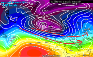 Η ζωνική ροή λοιπόν, ή ‘ ημιμεσημβρινή’, φαίνεται να κυριαρχεί τον Μάρτη , με τα βαρομετρικά συστήματα να ακολουθούν την κλασική τους πορεία από δυτικά προς ανατολικά. Ένα κλασικό παράδειγμα ‘ ημιμεσημβρινής’ ροής, είναι ο παρακάτω χάρτης, όπου προσέξτε το πως ο ατλαντικός αεροχείμαρος, δεν έχει αυστηρά ζωνική ροή, αλλά μια ελαφριά κλίση προς τα νότια, τόση ώστε να καταφέρνουν τα μέτωπα των βαρομετρικών χαμηλών της βόρειας Ευρώπης, να δίνουν περάσματα βροχών στην χώρα μας.